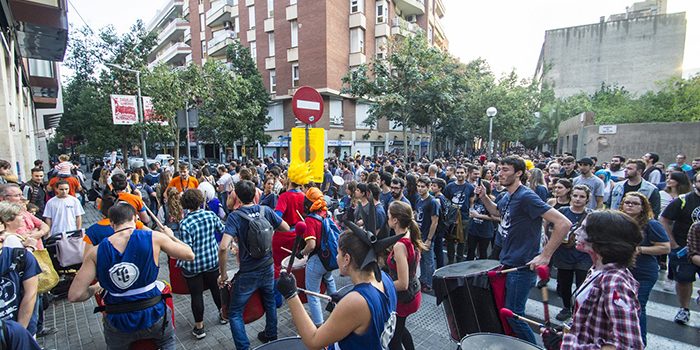 Més de 500 persones entre músics i servei d’ordre de Diables de Les Corts, colles convidades (els germans del nord, les Gàrgoles de Foc de Banyoles, i Karabassà de Sant Cugat del Vallès) i tota una munió de públic ens congreguem davant de l’Ajuntament de Les Corts per encetar el 14è Atabala’mmmm, amb la primera cervesa feta al Bar Comas.