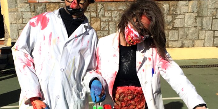 Durant alguns minuts hem sigut part de la celebració de carnaval d’aquests estudiants, tocant al pati de l’institut, rodejats d’alumnes que ballaven al ritme dels tabals. Tots ells disfressats amb divertits vestits de tota mena, acolorint l’espai, oblidant per una estona les obligacions i la feina escolar.
