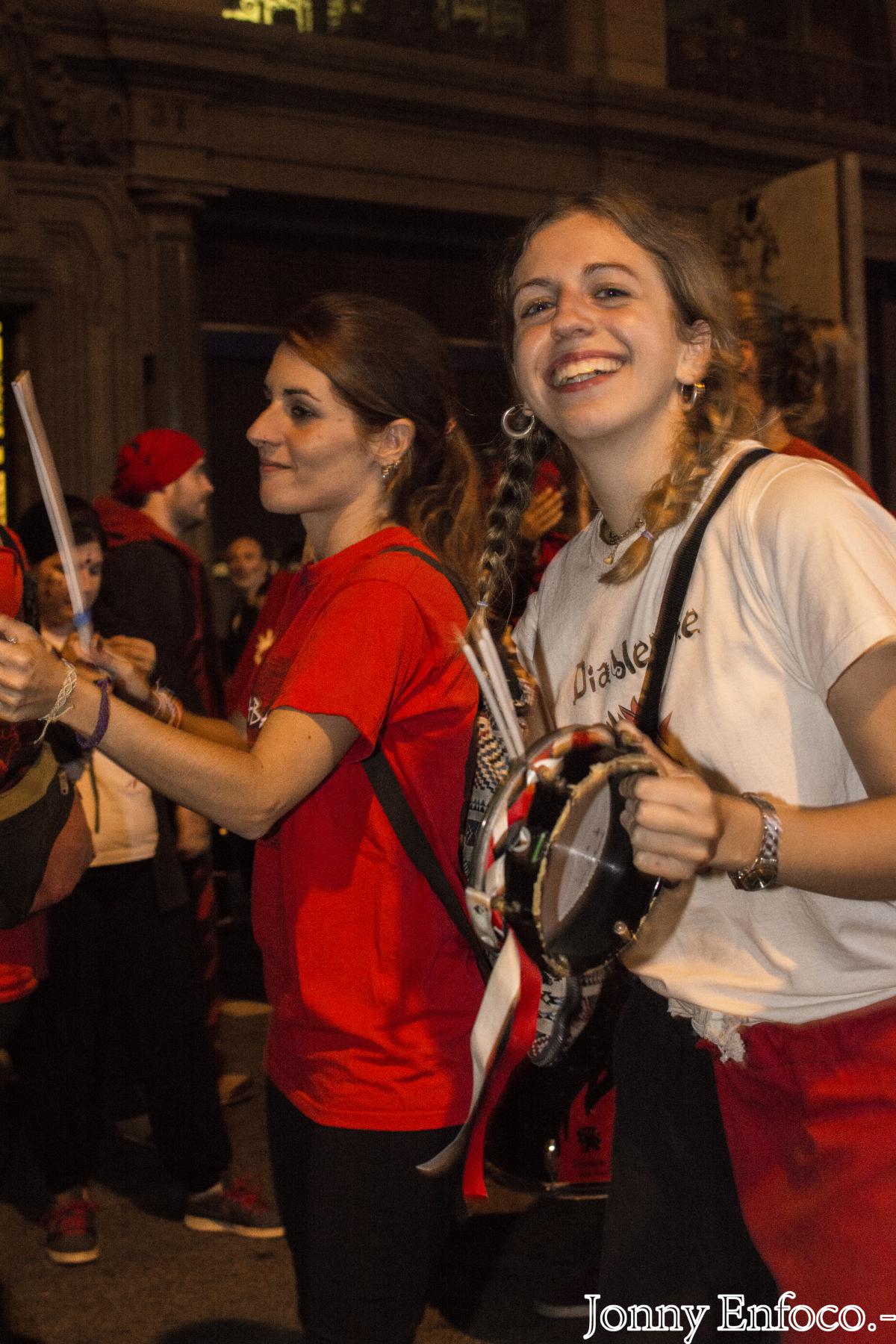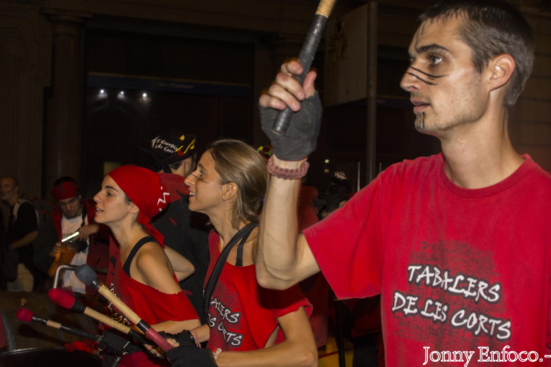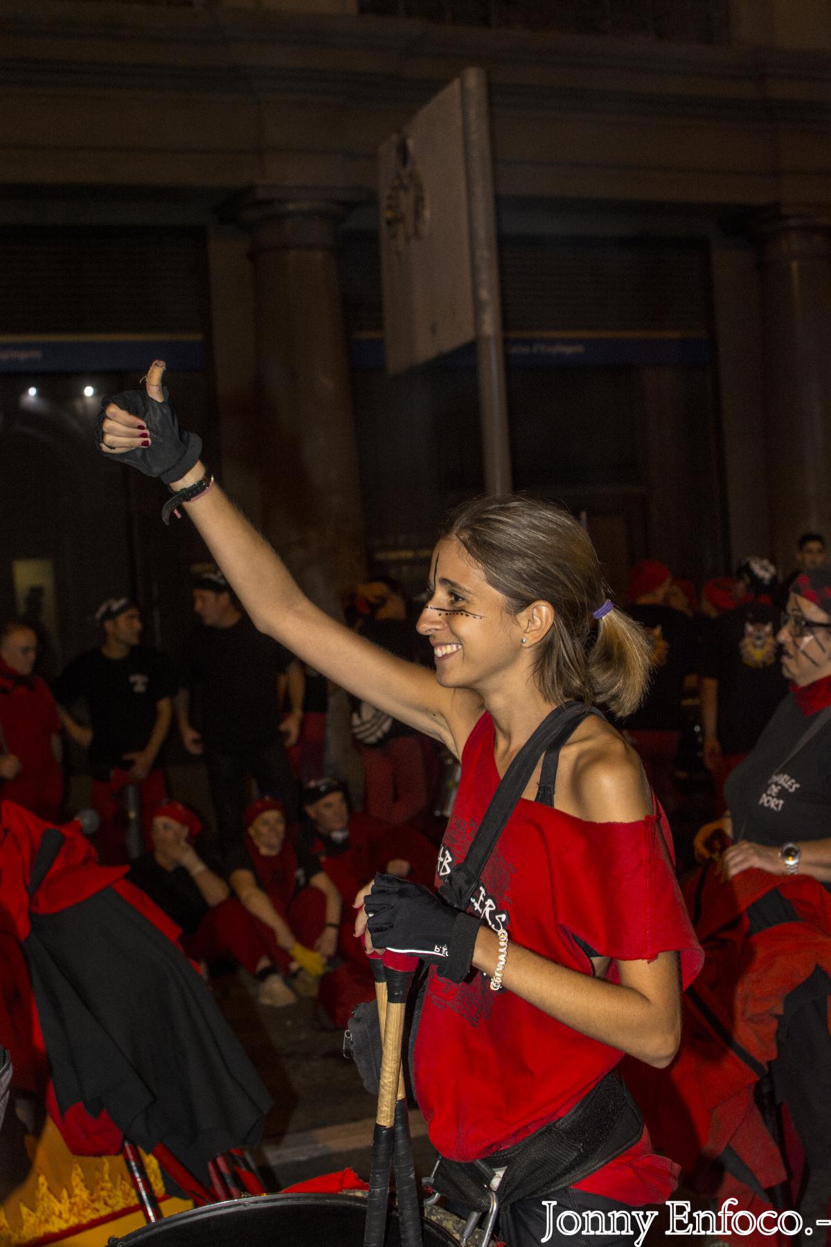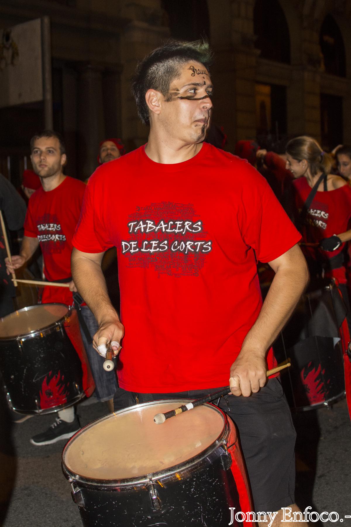 Al pair el menjar, els tabalers van marxar a la Tabalada de La Mercè, prèvia al correfoc. En la línia de novetats, dos recorreguts, un des del Mercat del Born i un altre des de la Plaça Reial, aquesta enfocada per les colles menudes que actuaven al Correfoc Infantil de La Mercè de la tarda. Des de la Plaça Comerç del Born fins a la Plaça Ramon Berenguer, vam donar-ho tot. En aquesta última plaç, era el lluïment i animació estàtica de les colles de percussió fins que obrissin el tancat darrera de la Porta de l’Infern de Via Laietana, tant pels grups com bèsties de foc del correfoc adult.
