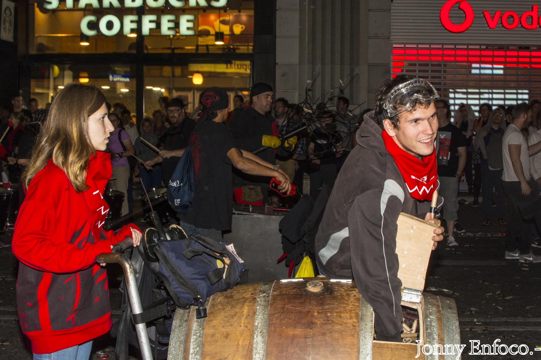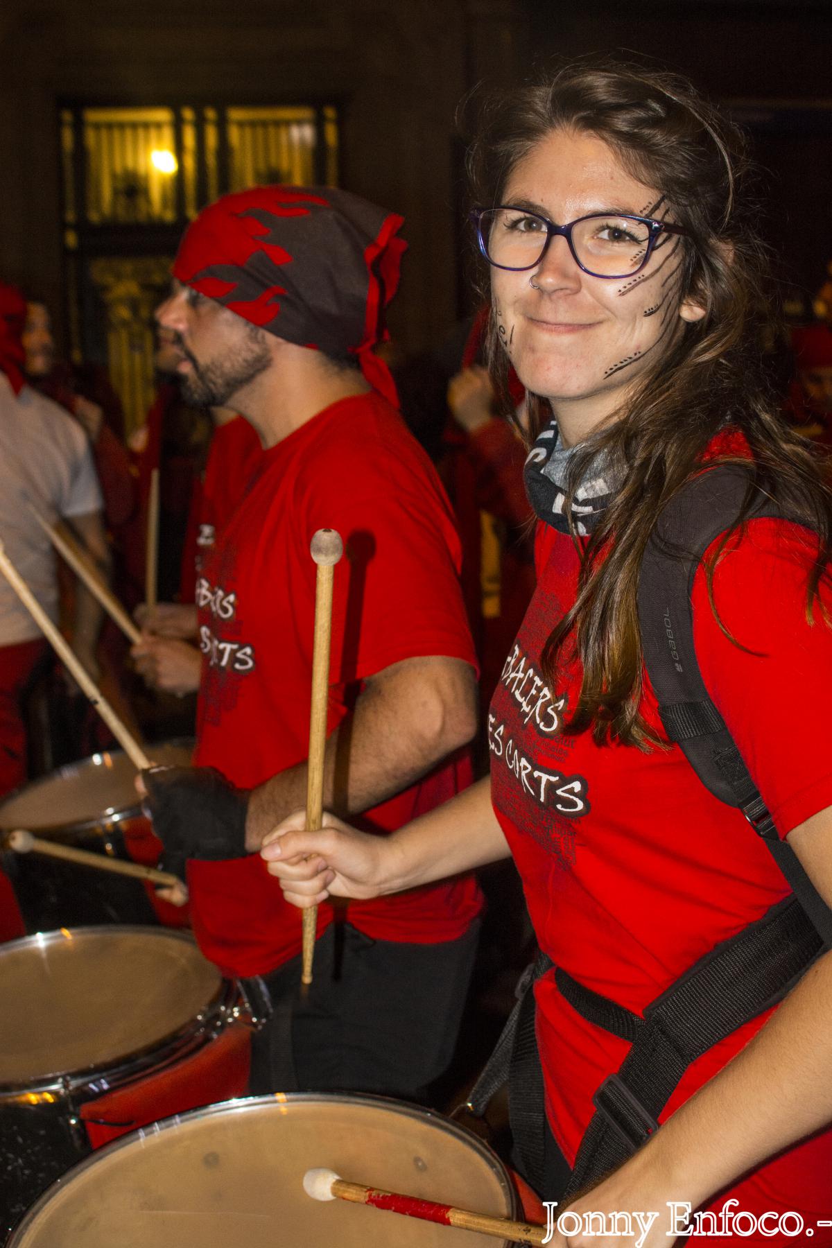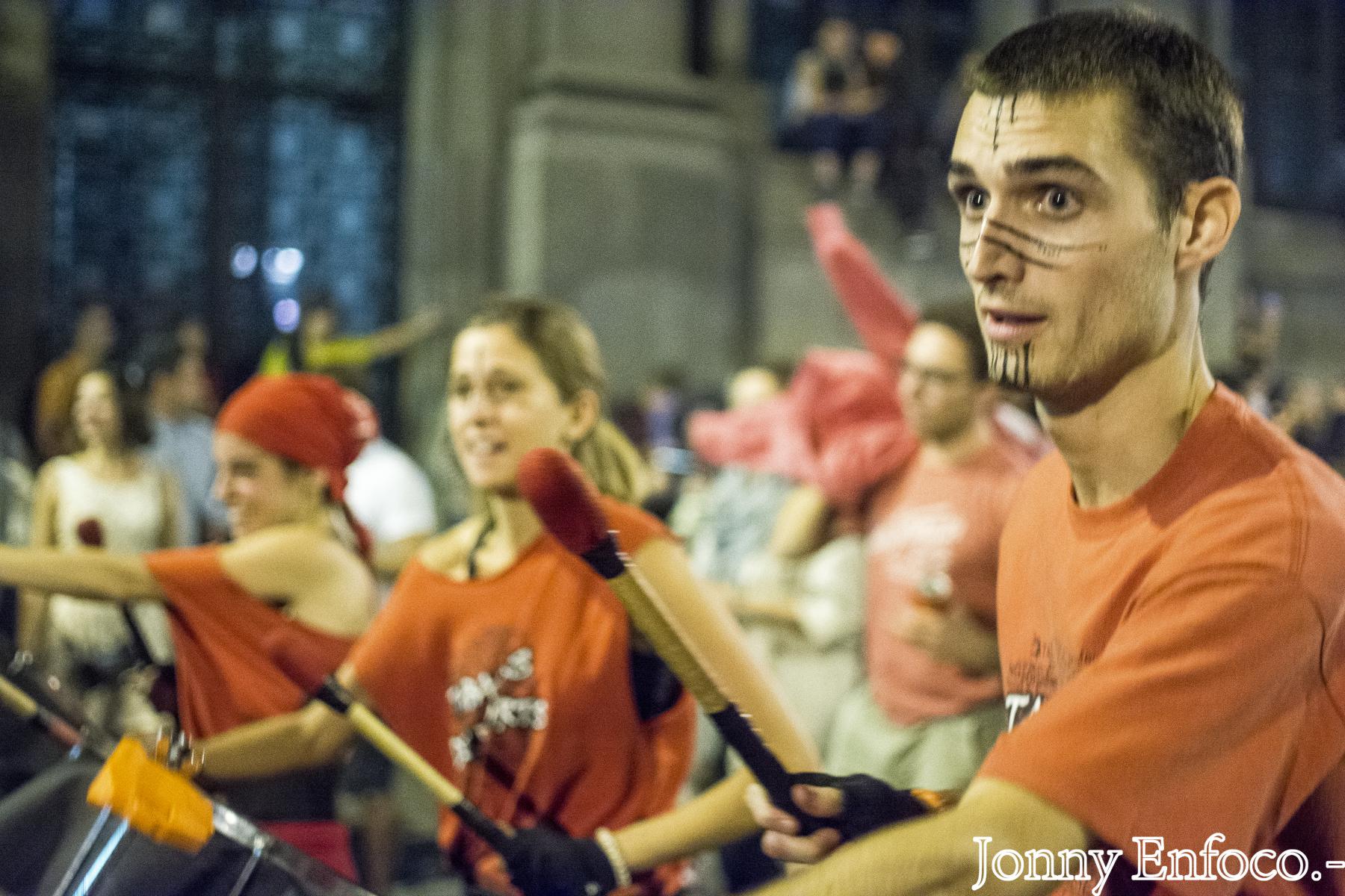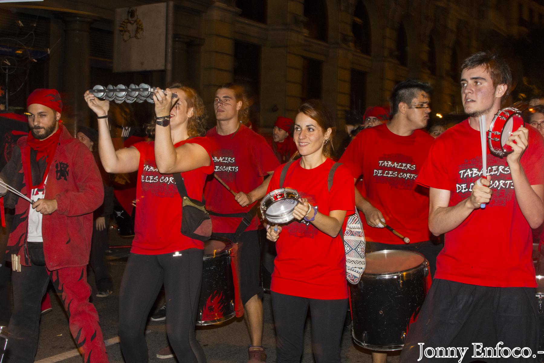 Al pair el menjar, els tabalers van marxar a la Tabalada de La Mercè, prèvia al correfoc. En la línia de novetats, dos recorreguts, un des del Mercat del Born i un altre des de la Plaça Reial, aquesta enfocada per les colles menudes que actuaven al Correfoc Infantil de La Mercè de la tarda. Des de la Plaça Comerç del Born fins a la Plaça Ramon Berenguer, vam donar-ho tot. En aquesta última plaç, era el lluïment i animació estàtica de les colles de percussió fins que obrissin el tancat darrera de la Porta de l’Infern de Via Laietana, tant pels grups com bèsties de foc del correfoc adult.