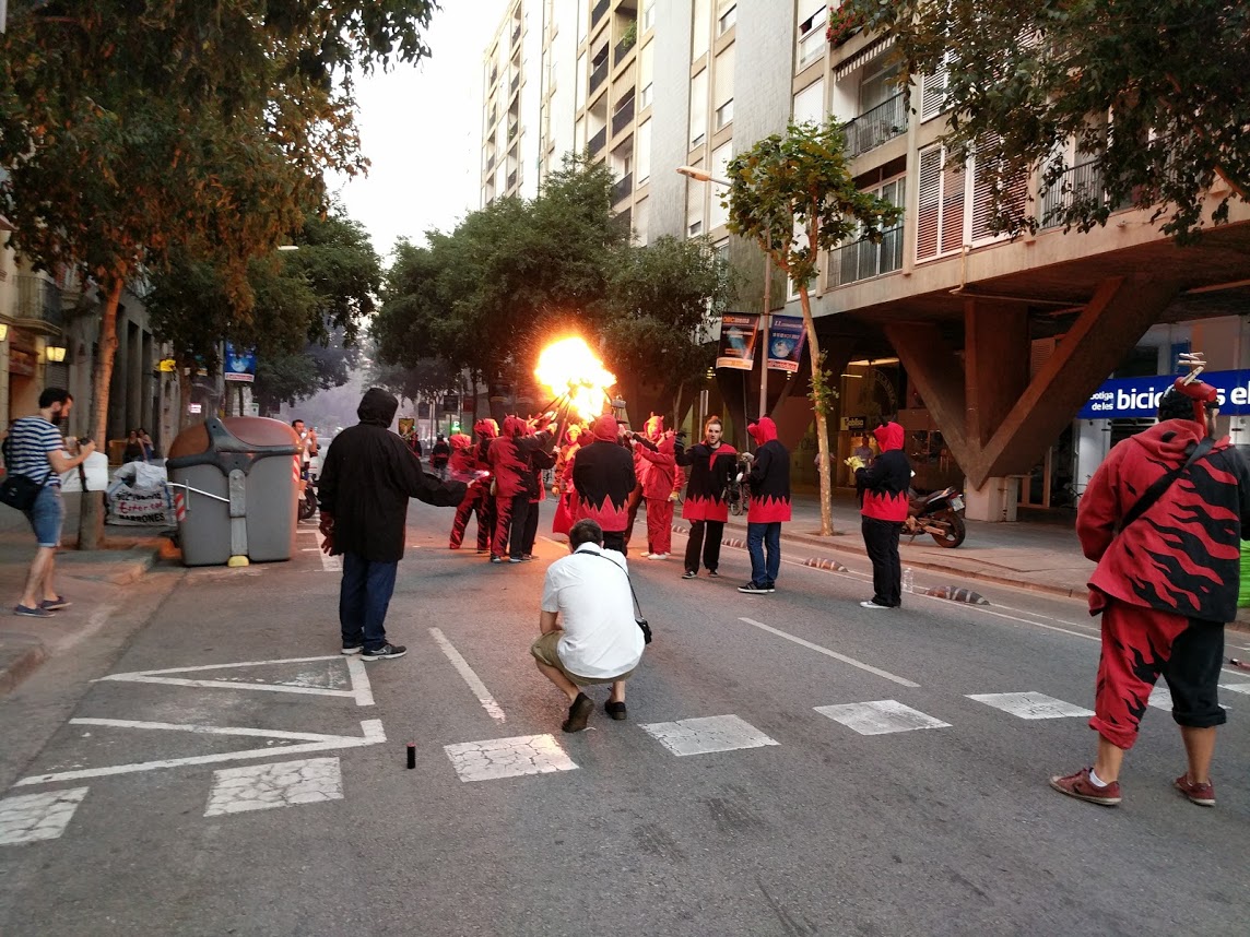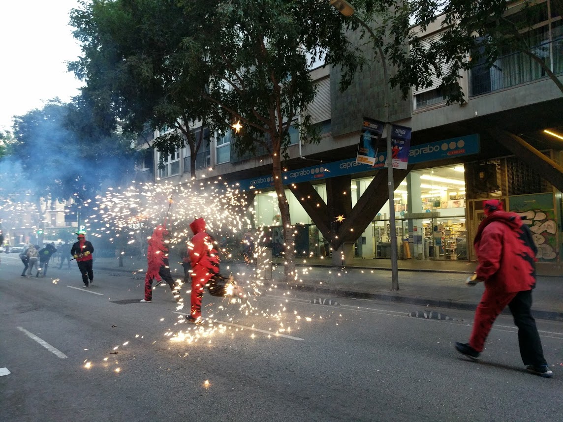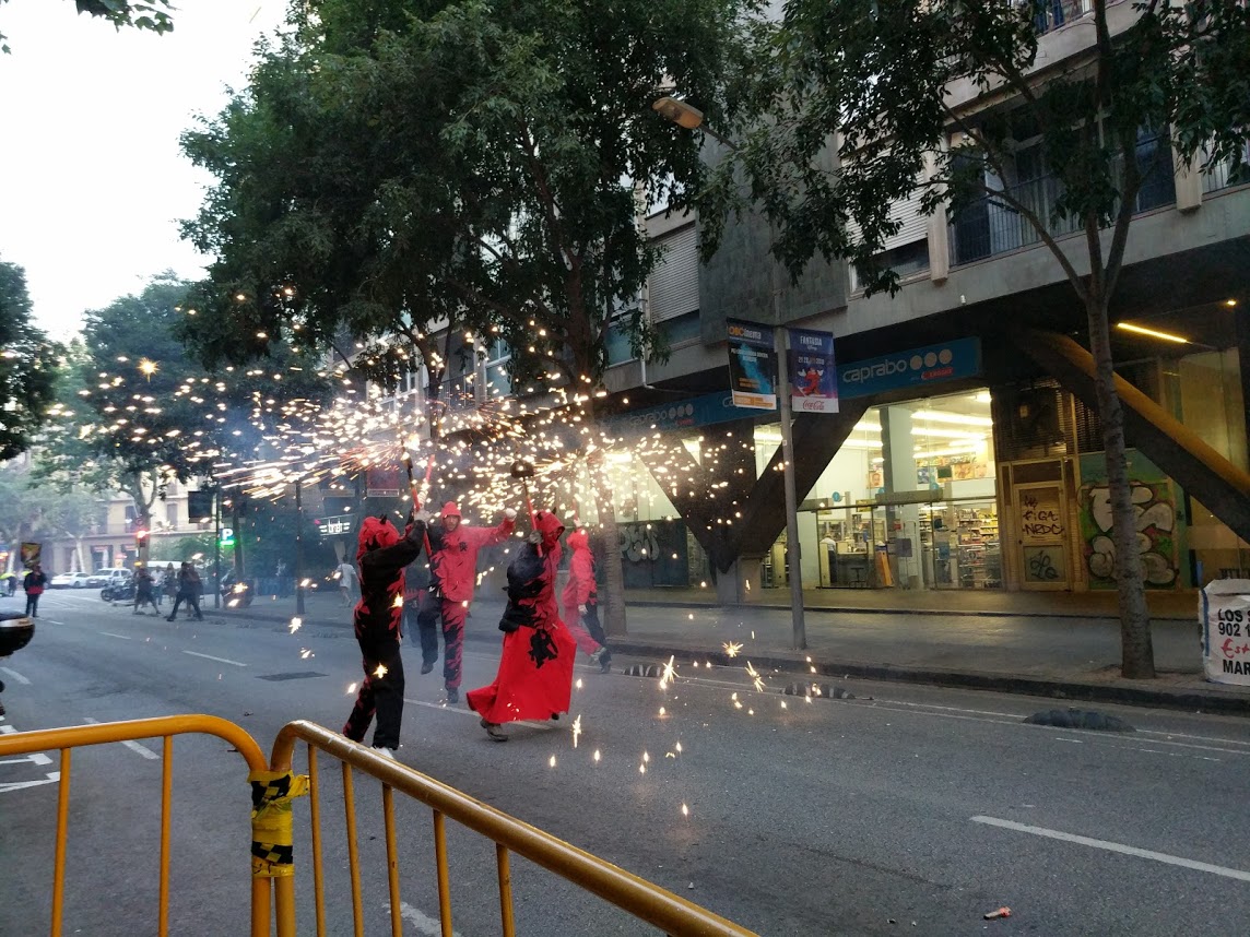 Amb l’encesa de la foguera per part dels diables, començava el Correfoc de Sant Joan! Desenes de curiosos i fans de la pólvora ens van acompanyar al llarg del recorregut, ple de foc verd, vermell i groc! Molts turistes, com sempre, van al·lucinar amb la marxa dels cremadors i tabalers. Amb el retorn a la foguera i una encesa final, vam cloure la celebració amb els companys de l’Esquerra Infernal. Això si, abans de marxar, vam gaudir del ambient de tot el veïnat que havia baixat a sopar a la revetlla, amb unes rondes de cerveses i salivant per la botifarrada organitzada per les entitats i col·lectius d’aquest barri barceloní.