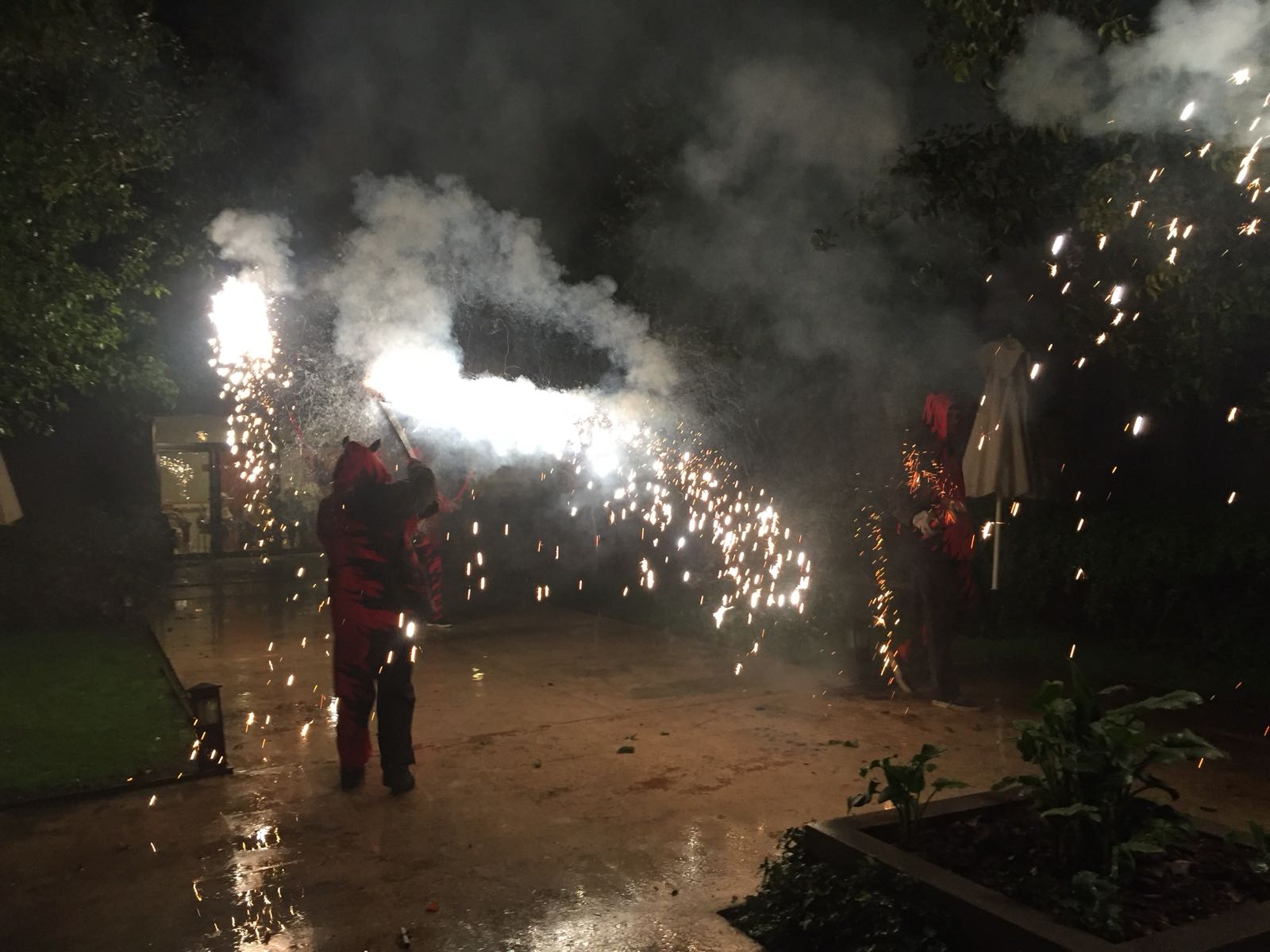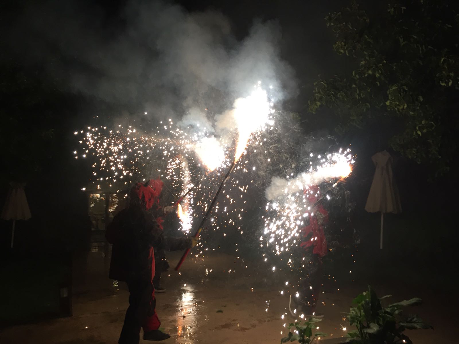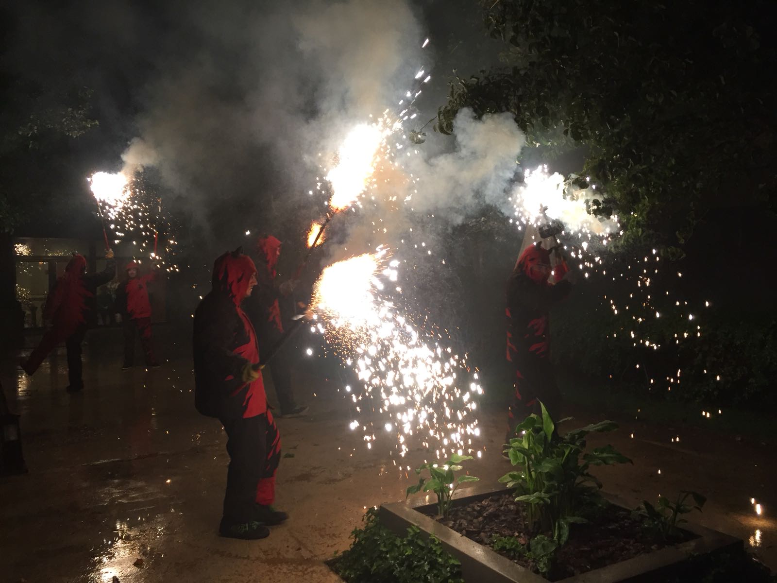 El passat dimecres 18 d’octubre, tot i la pluja, vam poder realitzar l’espectacle de foc i percussió que teníem preparat per treure un somriure als nostres veïns més grans. Vam omplir el pati de llum i color amb les espurnes dels diables que ballaven sense parar, tot al ritme dels tabals.