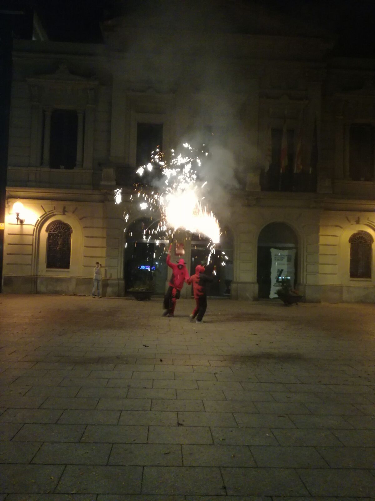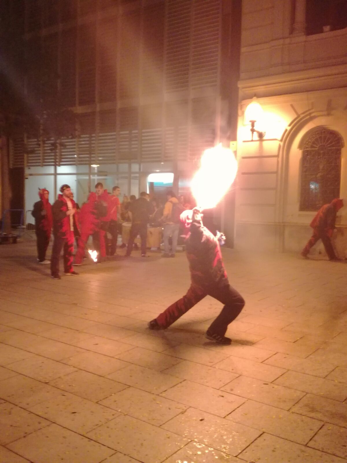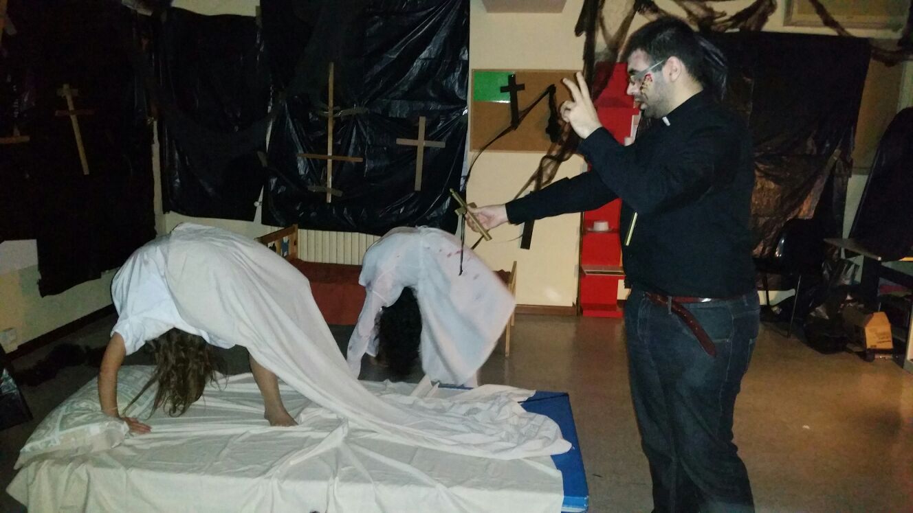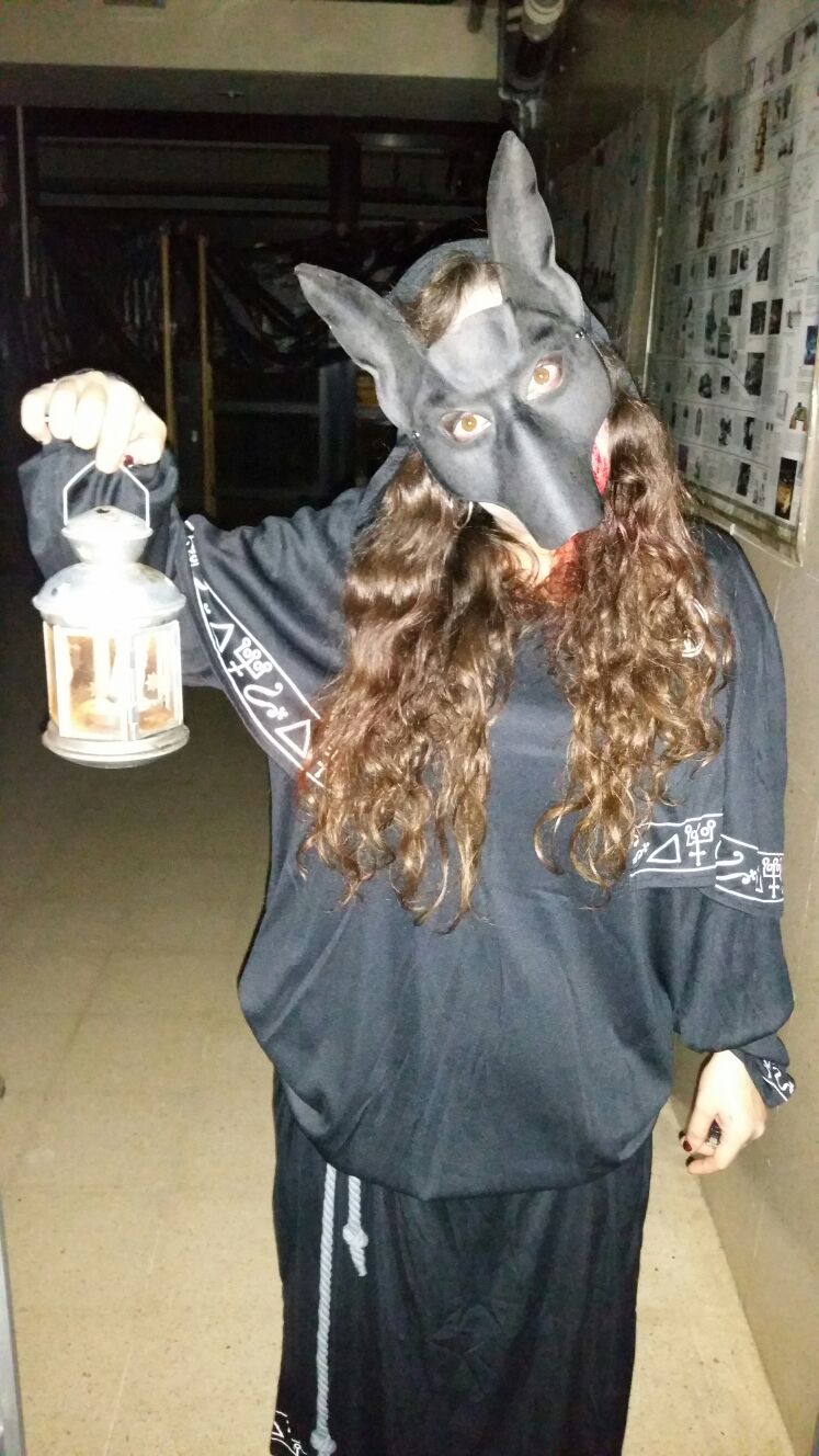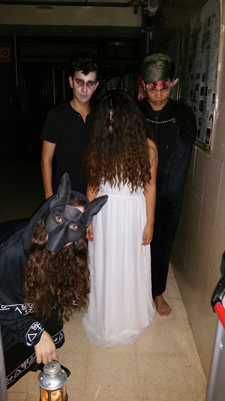 Tot va començar amb un espectacle de foc i percussió a la plaça Comas… Entre la festa i el foc, un diable va morir de manera sobtada. D’entre el públic va sorgir una figura sinistre que cridava esbojarradament coses sense sentit. Així va començar una processó fúnebre cap al Casal de Joves, on ja hi vam trobar una cua de gent esperant per entrar al passatge del terror.