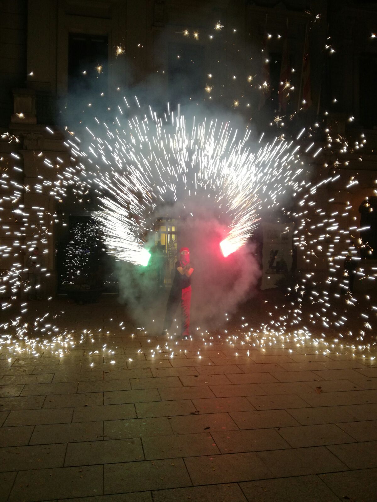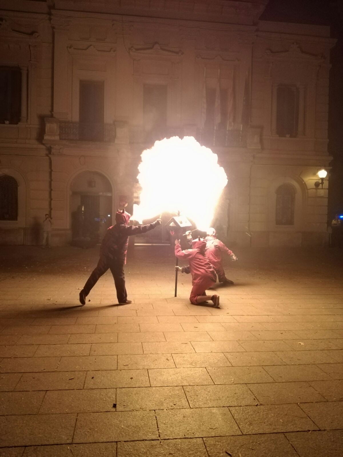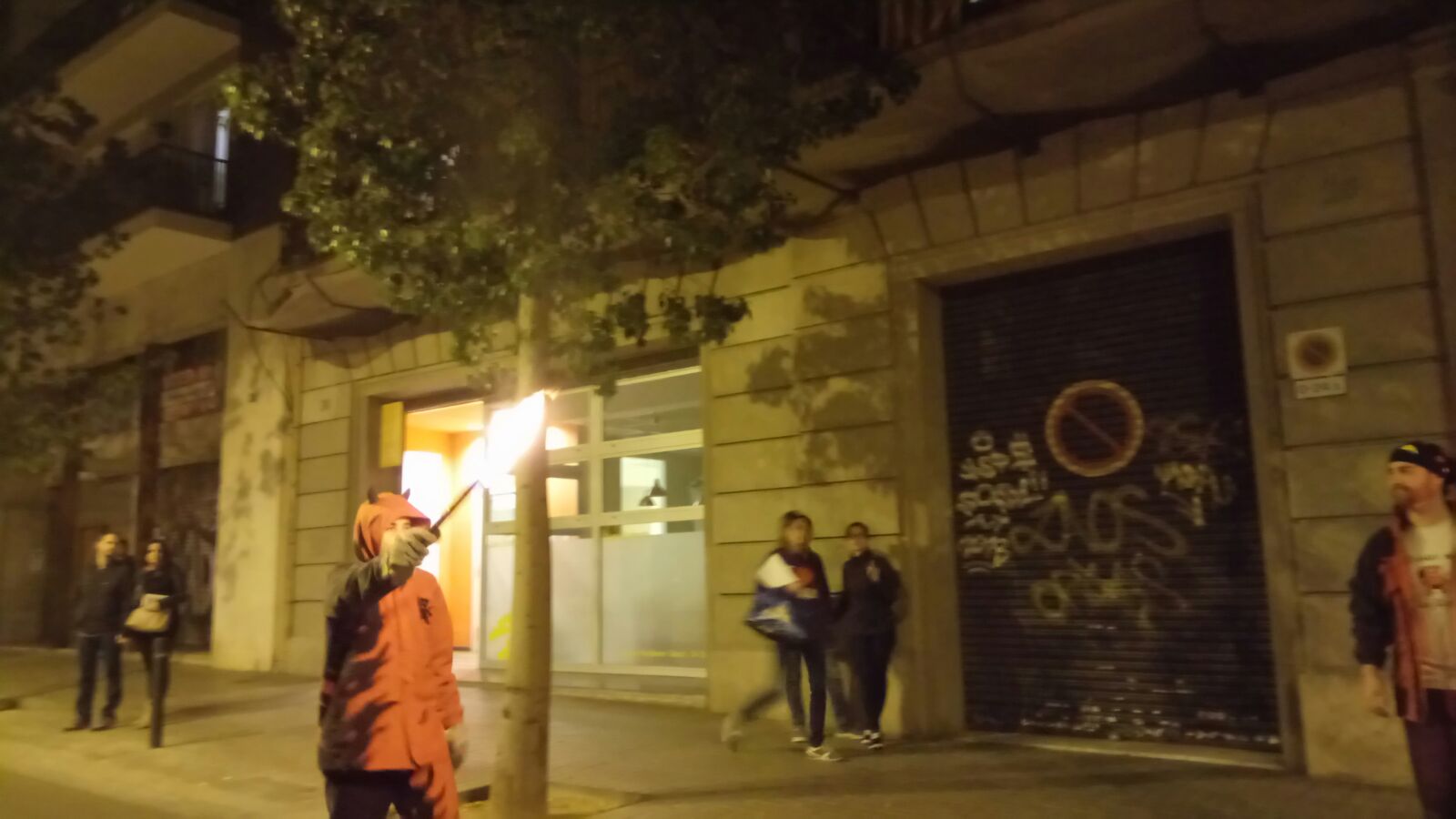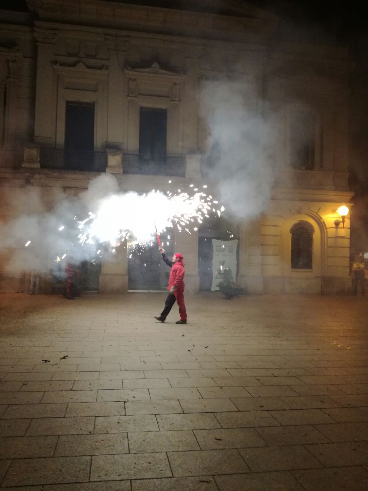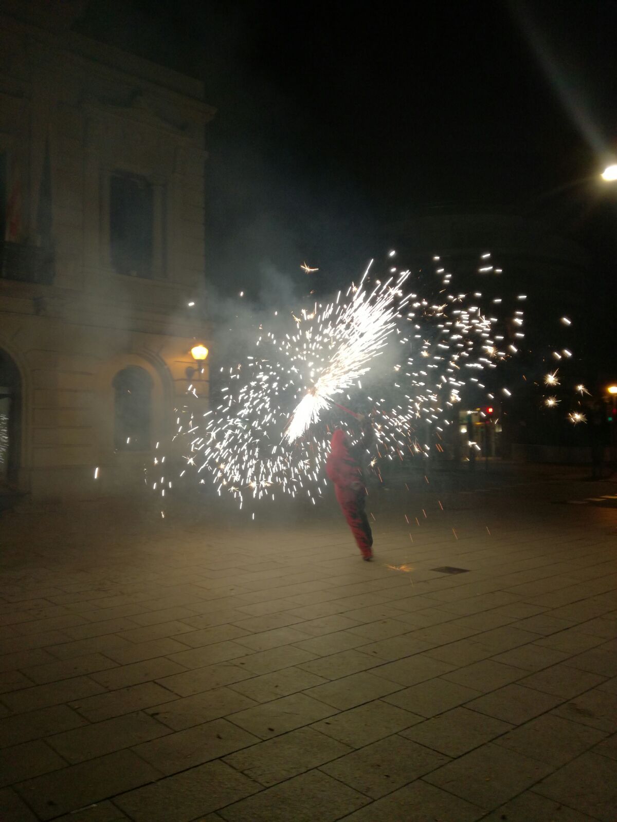 Tot va començar amb un espectacle de foc i percussió a la plaça Comas… Entre la festa i el foc, un diable va morir de manera sobtada. D’entre el públic va sorgir una figura sinistre que cridava esbojarradament coses sense sentit. Així va començar una processó fúnebre cap al Casal de Joves, on ja hi vam trobar una cua de gent esperant per entrar al passatge del terror.