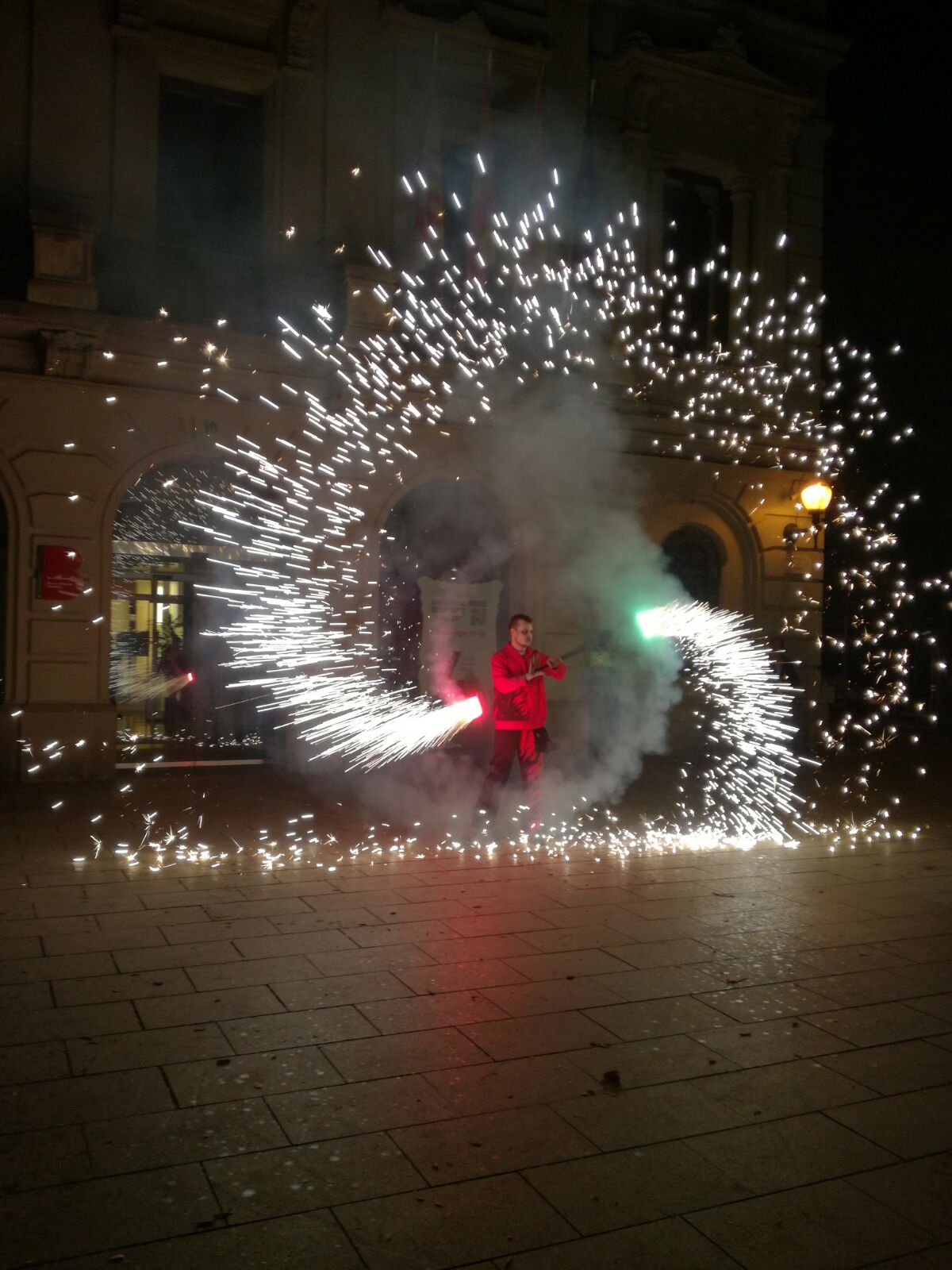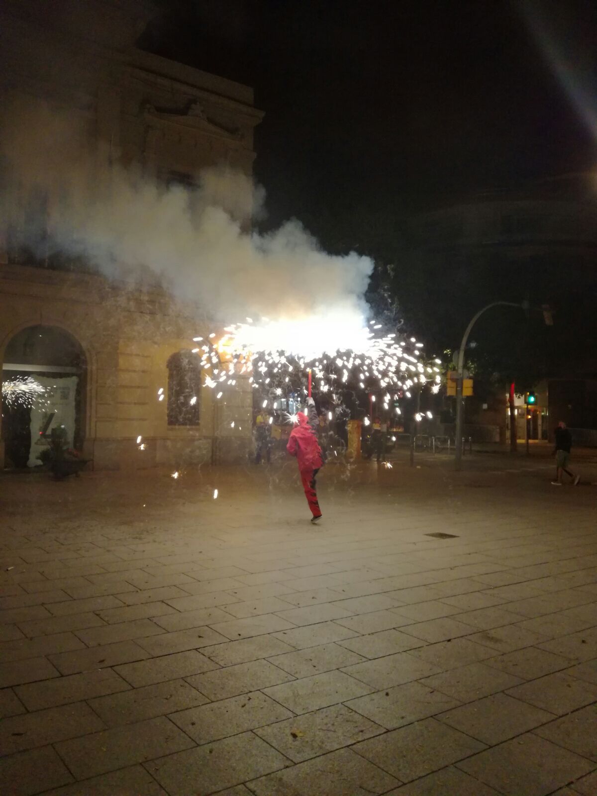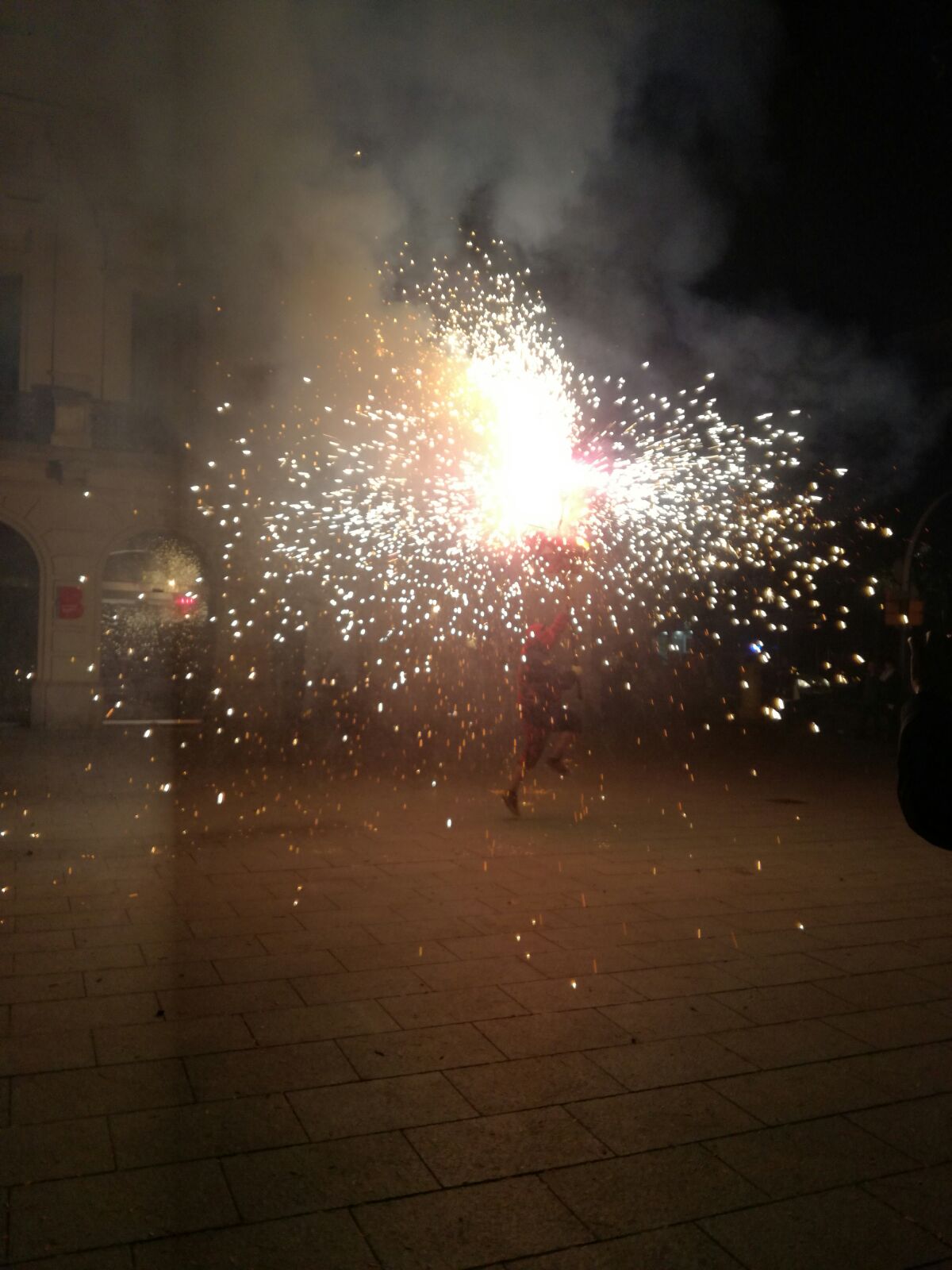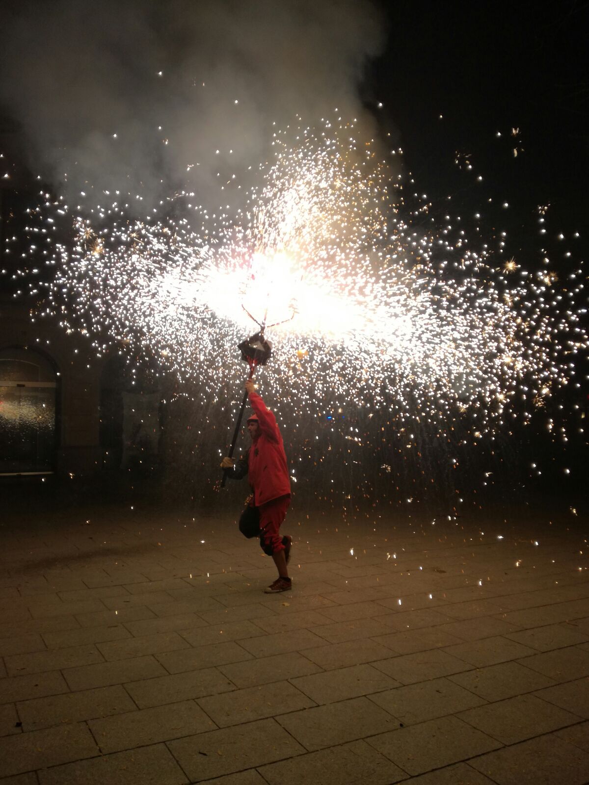 Tot va començar amb un espectacle de foc i percussió a la plaça Comas… Entre la festa i el foc, un diable va morir de manera sobtada. D’entre el públic va sorgir una figura sinistre que cridava esbojarradament coses sense sentit. Així va començar una processó fúnebre cap al Casal de Joves, on ja hi vam trobar una cua de gent esperant per entrar al passatge del terror.