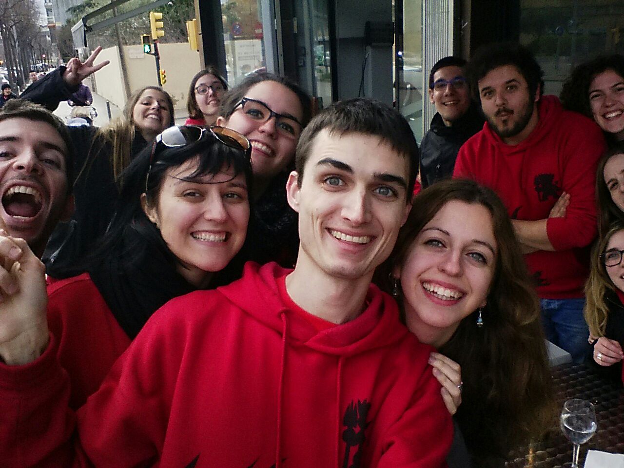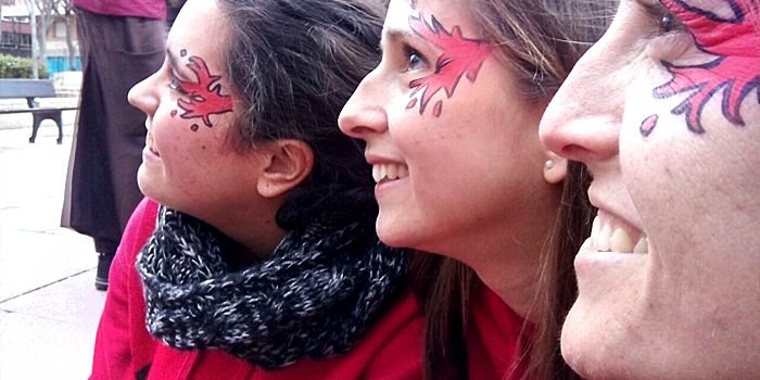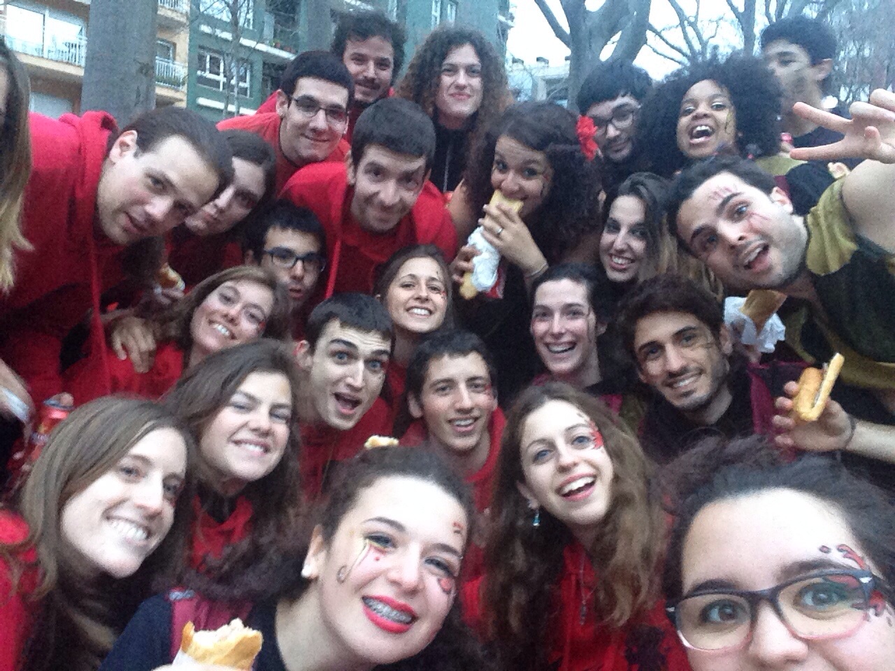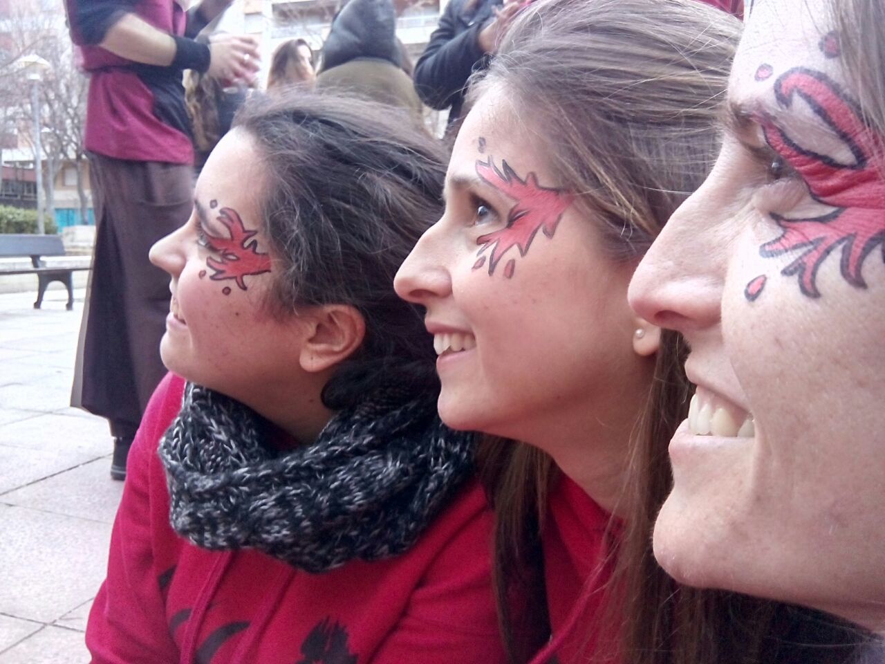 Un cop allà, amb un temps encara incert, vam trobar-nos amb un Centre Cívic / Casal de Joves que era, ni més ni menys, una petita masia enmig del barri de Santa Eugènia. Vam dinar, fent parar bojos els amos del restaurant amb les anades i vingudes de plats i, amb la panxa ben plena, ens vàrem maquillar amb la nova proposta de patró de maquillatge pels bolos, una flama vermella que surt de la templa i embolcalla l’ull esquerre, emulant el disseny de les dessuadores que vàrem estrenar per la Cavalcada de Reis i el diablillu del 20è aniversari de la colla.