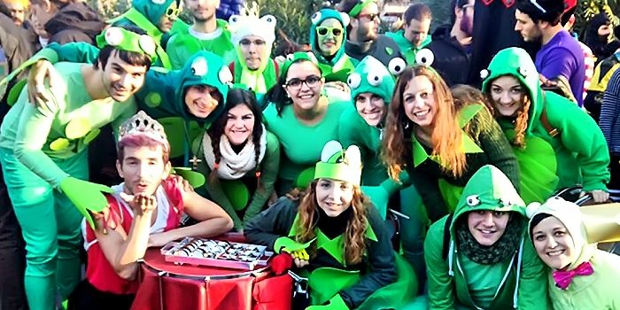 La Plaça Comas era ben plena per veure passar totes les comparses, i per que aquestes fessin els seus lluïments davant del Jurat de la Rua, prenent nota al balcó de la Seu del Districte. Els Princesots i Croacs de Les Corts, la comparsa de Diables de Les Corts d’enguany, va donar la nota -tant pel ritme i la diversió dels tabals- com per la munió de granotes i gripaus que passaven pels ulls de la resta de comparses i veïns congregats en un acte tan nostrat i per totes les edats del barri. Amb les granotes i gripaus diableros els acompanyaven tres princeses -bé, princesots- que semblaven sortir més d’un malson que d’un compte de somni!!!