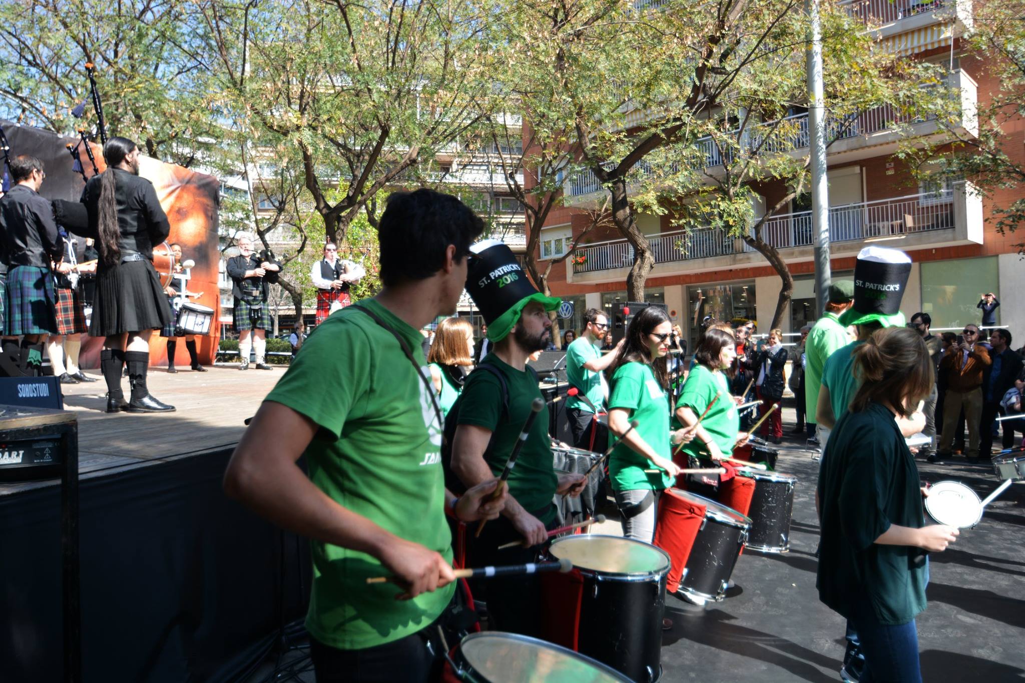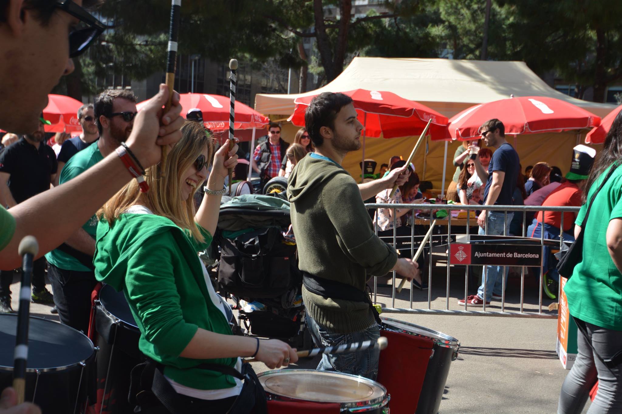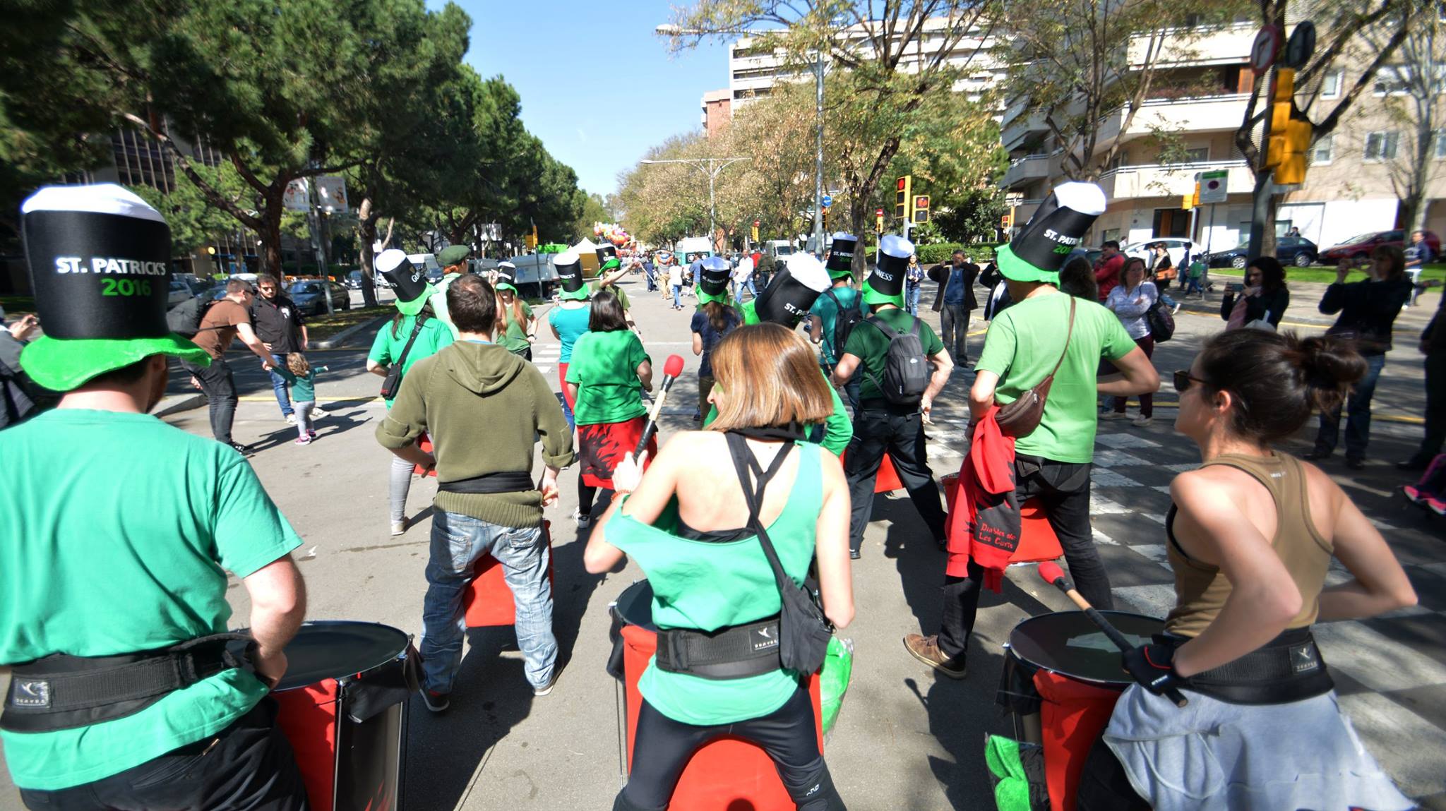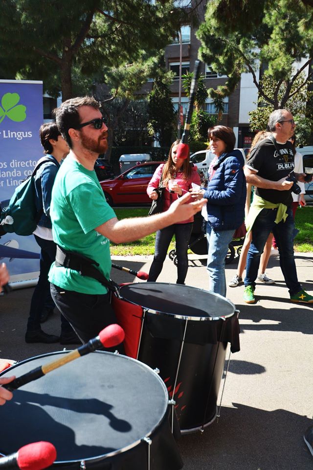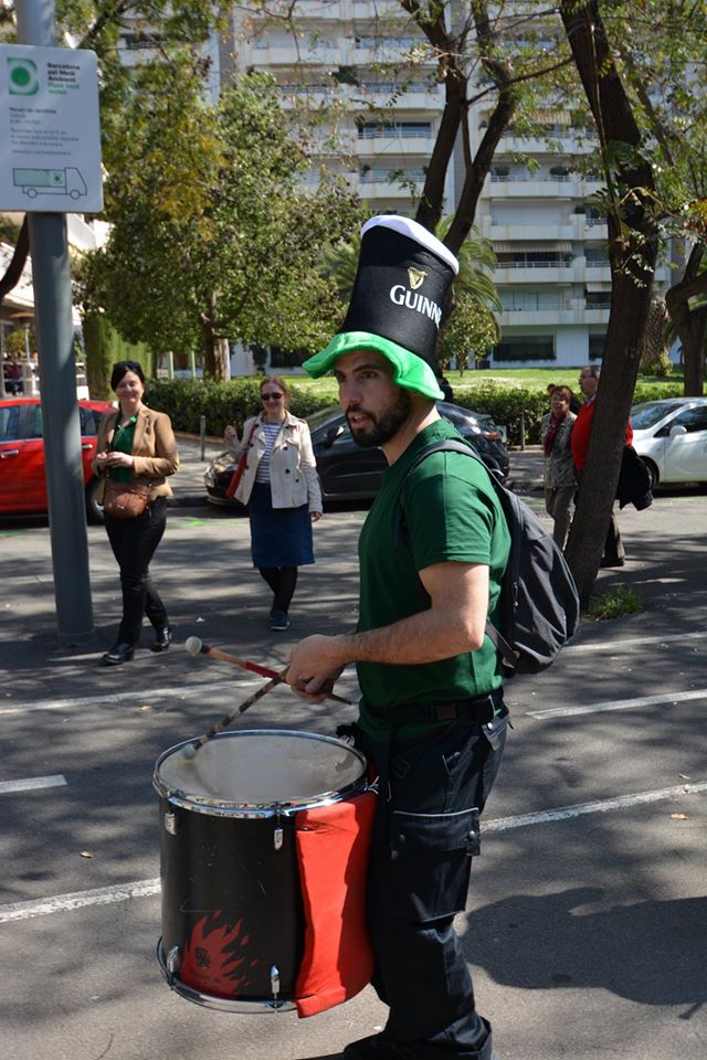 A les 11:30 vam fer una gran tabalada pujant des de la Diagonal fins quasi bé a dalt de tot de Numància, on vam poder compartir un moment únic d’unió de cultures catalana i irlandesa, tocant juntament amb el grup de gaites celta, la City of Barcelona Pipe Band. Un cop vam acabar vam gaudir de la música irlandesa i dels balls típics que ens feien moure sense parar.