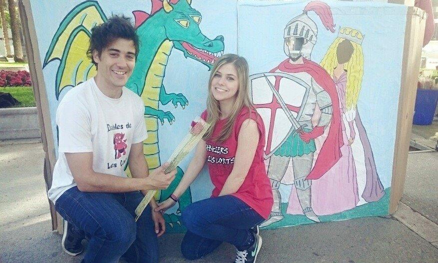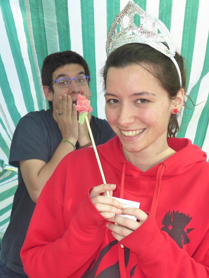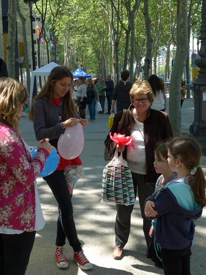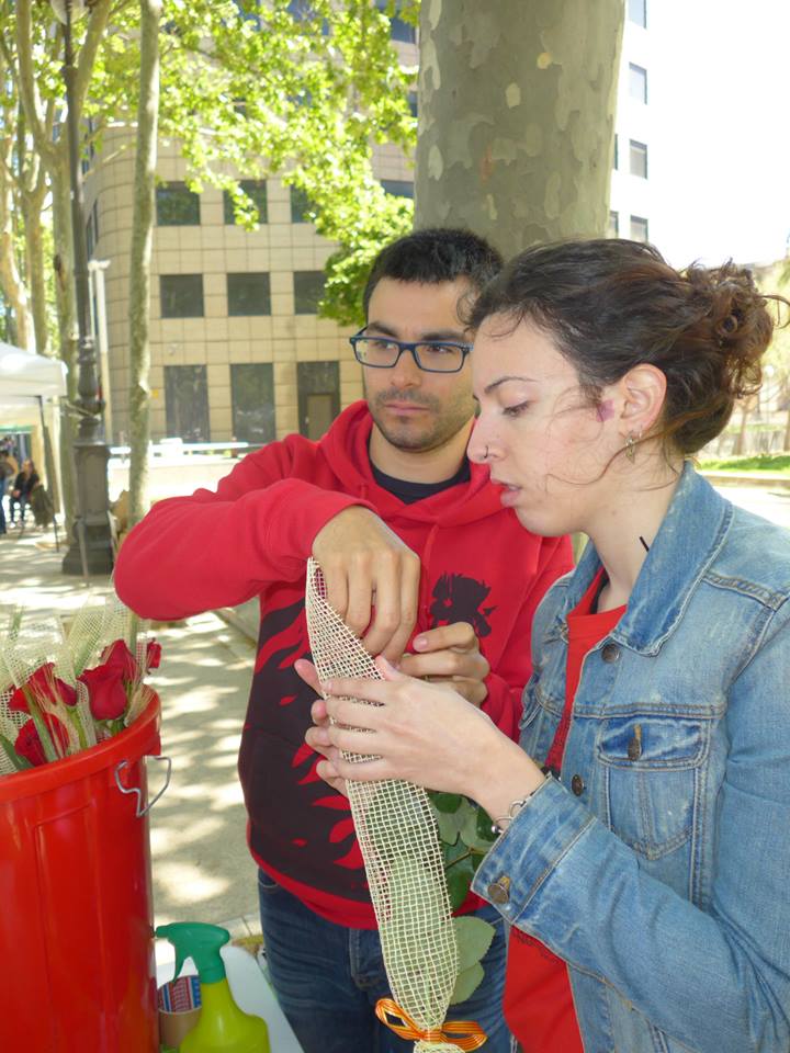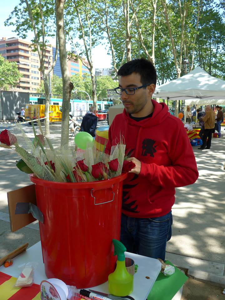 A la nostra súper paradeta situada al bell mig de la Diagonal disposàvem de molts objectes simbòlics de la colla com la forca i el capgros d’en Pau Farinetes. Però aquest any com a novetat e innovació teníem un fantàstic photocall del drac, el príncep i la princesa fet per tots nosaltres on, tant nens com nenes, parelletes, gent gran o joves van passar una estona divertida fent-se fotografies que podeu trobar al nostre Facebook. També teníem roses de diferents materials (fins i tot roses que es podien menjar!!!), cupcakes d’essència de rosa, punts de llibre, xapes, fermalls cosits a mà…