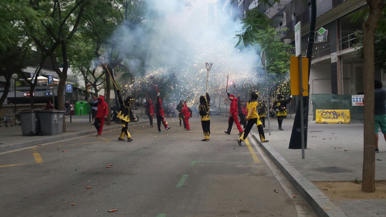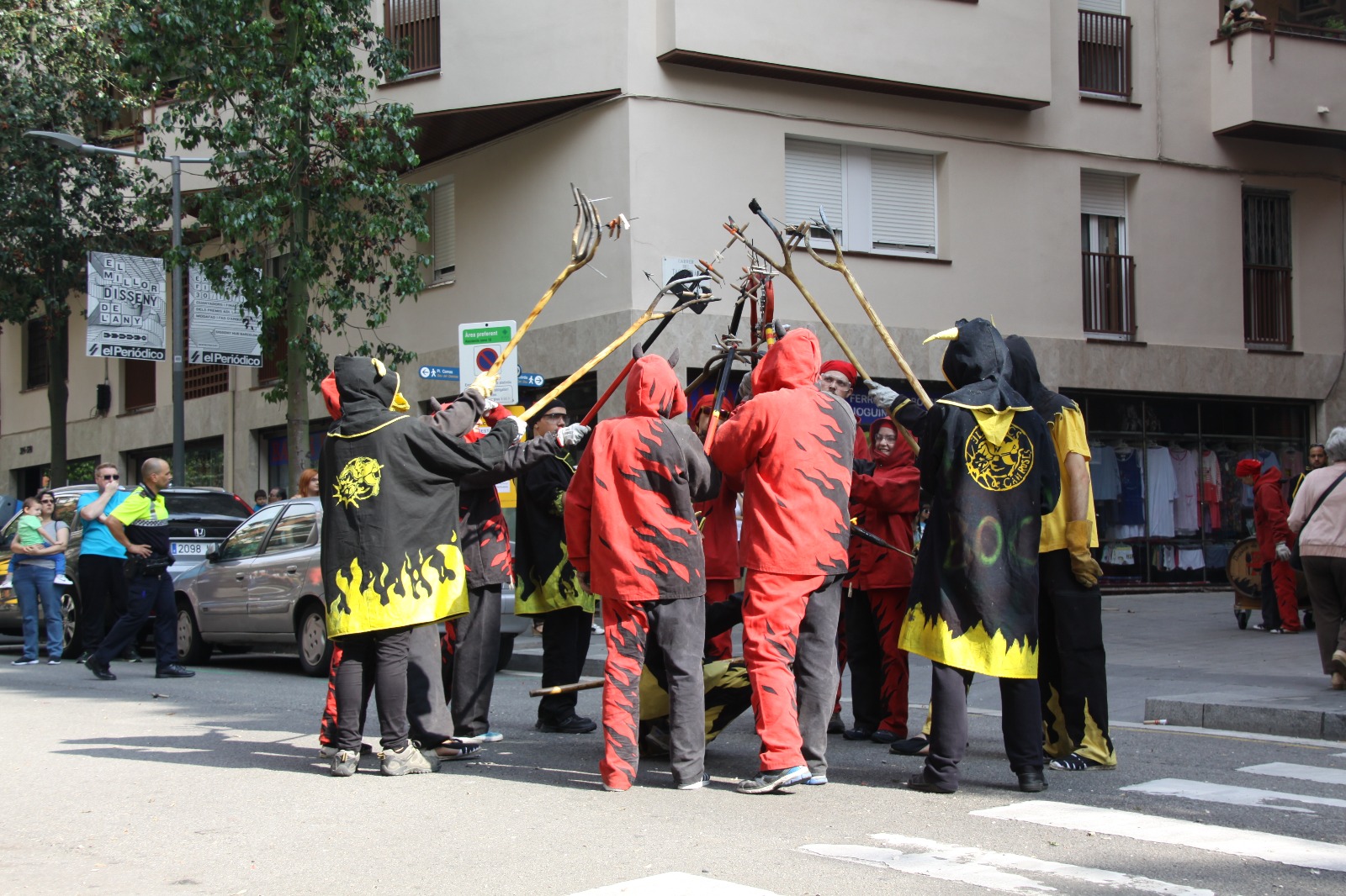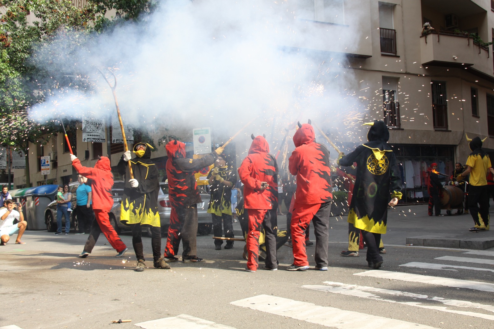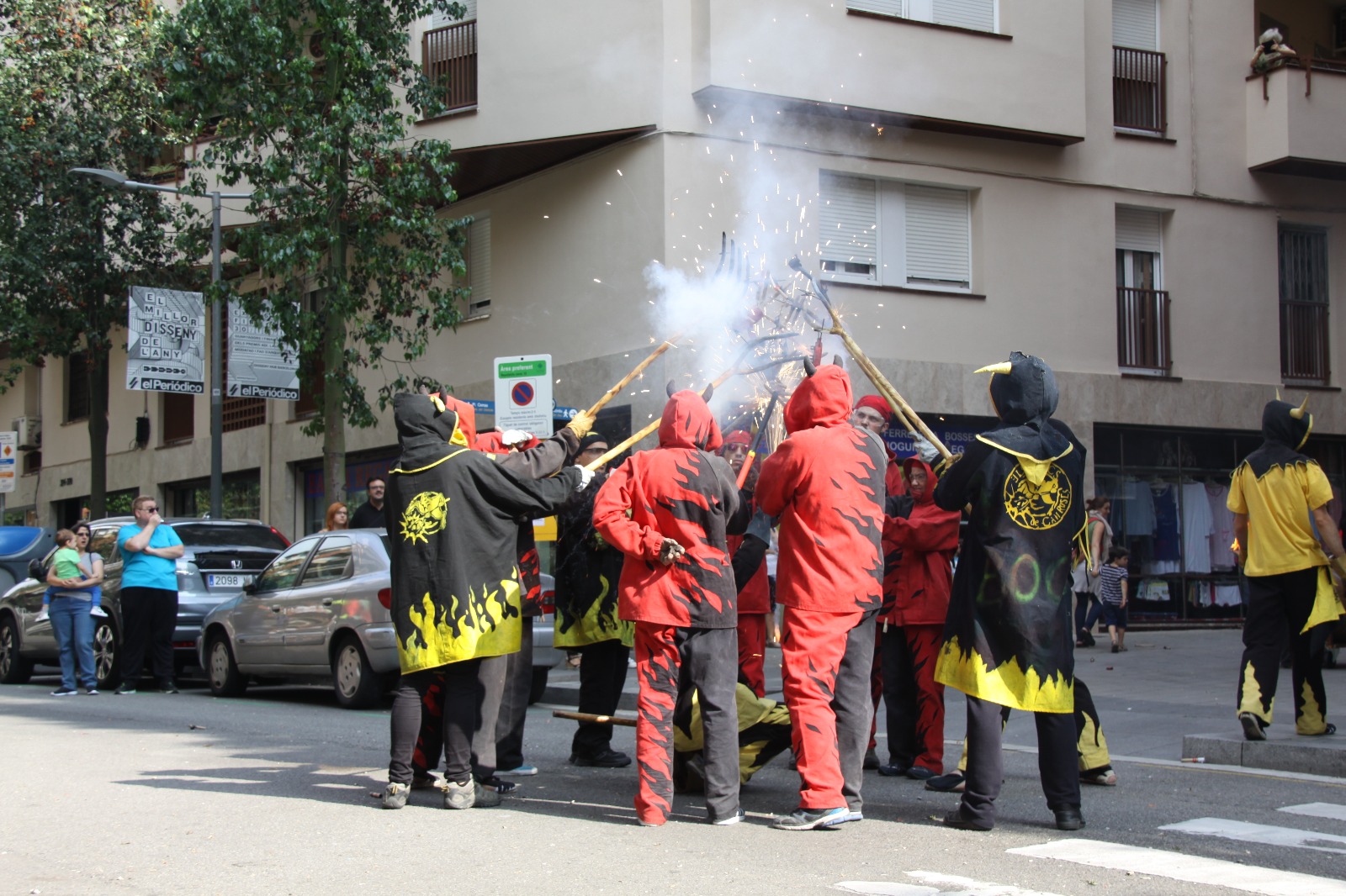 Totes les colles vam començar el particular cercavila a la Avinguda Diagonal Diagonal amb el carrer de Joan Güell, preparats per endinsar-nos un cop més al casc antic del nostre barri. Les dues colles adultes de foc i percussió que compartim el barri, Bocs i Diables, vàrem cremar de manera conjunta durant tot el seguici donant, un cop més, un espectacle sublim que tothom va gaudir i aplaudir. A més a més de treure a remenar les ales del Guardià de Les Corts, conjuntament amb Bocs i Repúbli-k de l’Avern!