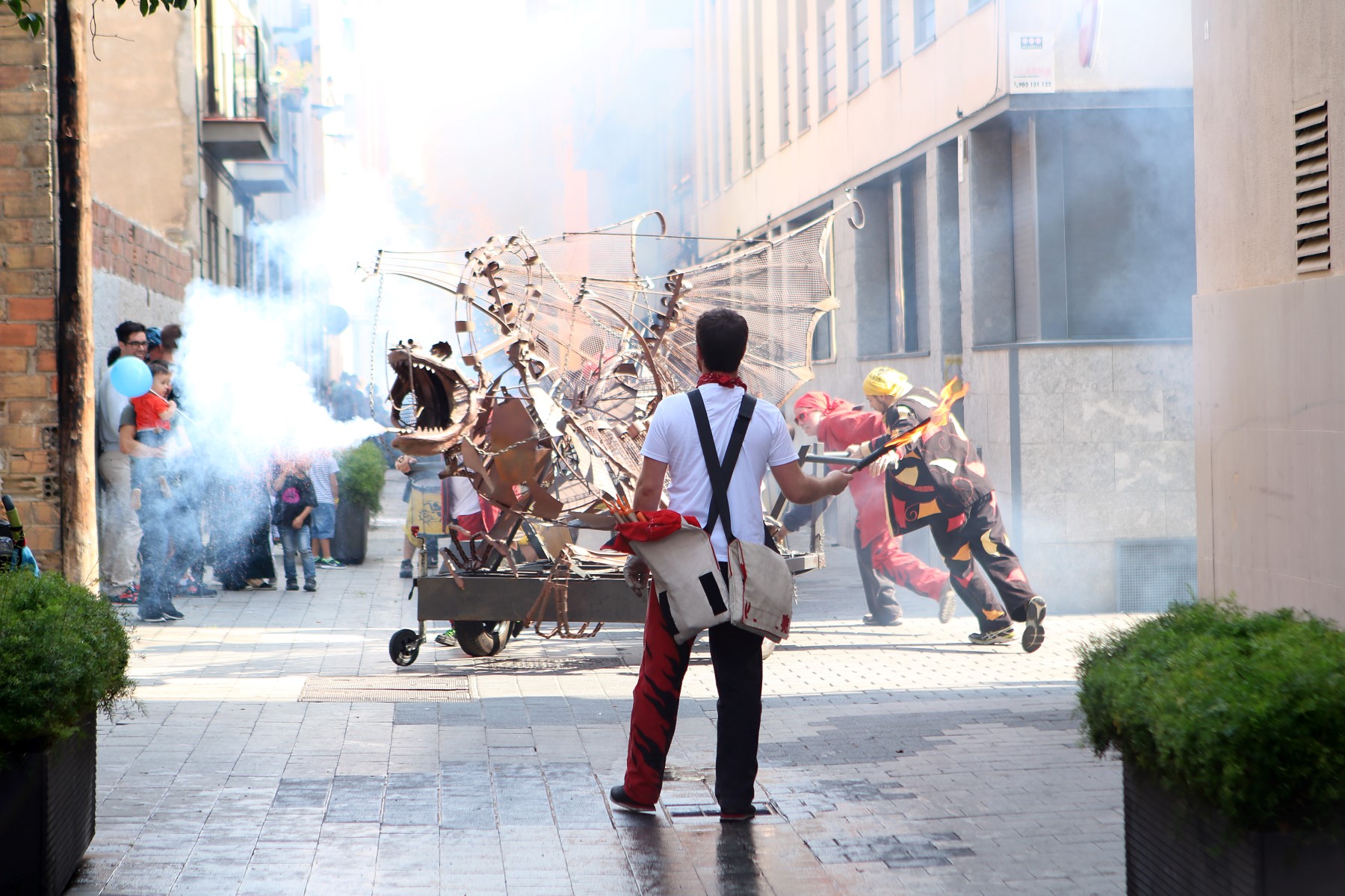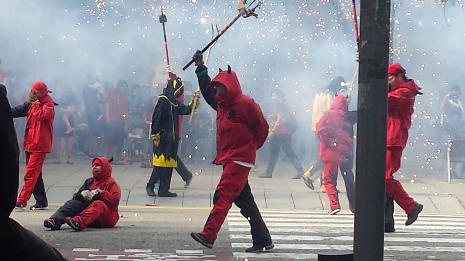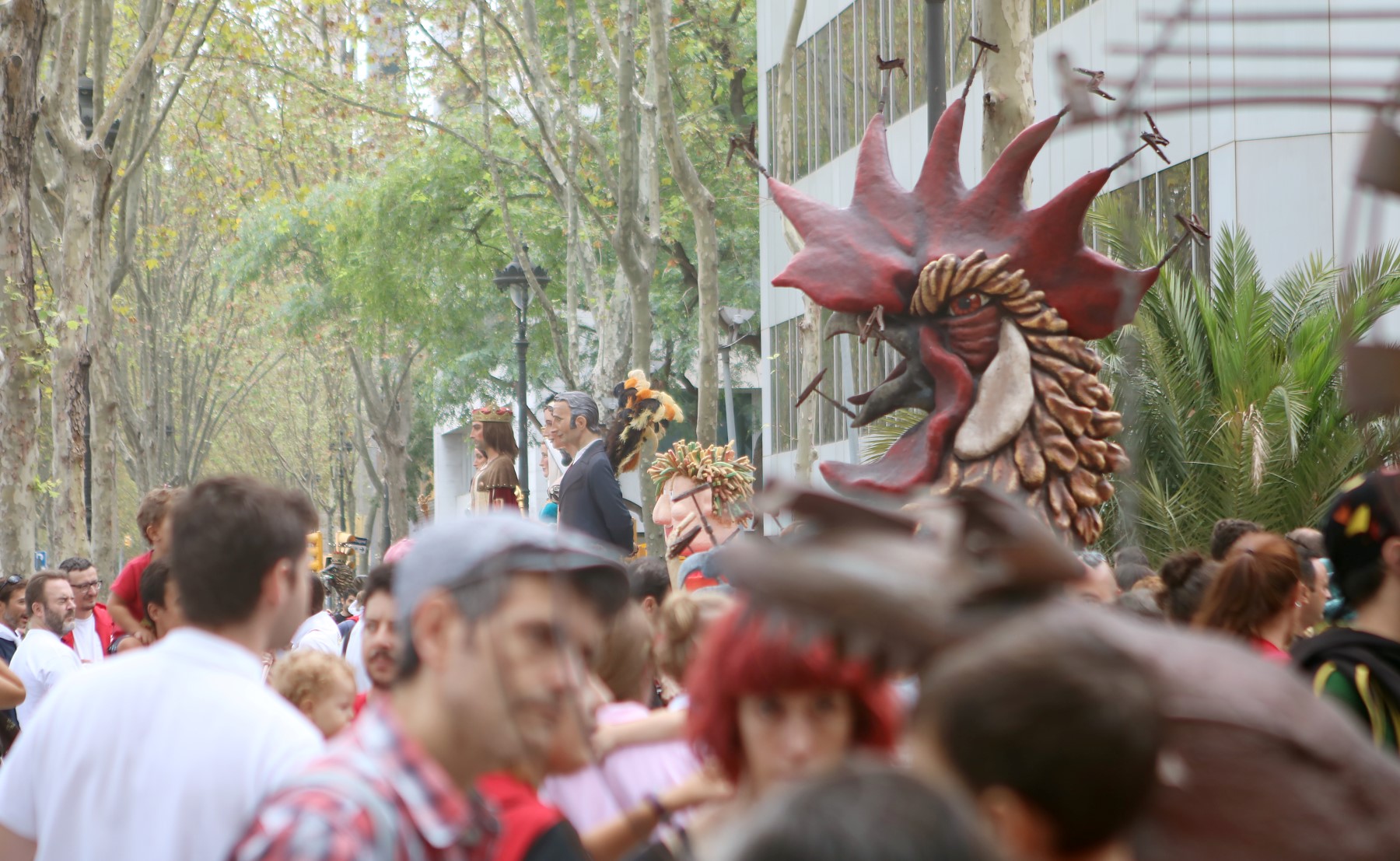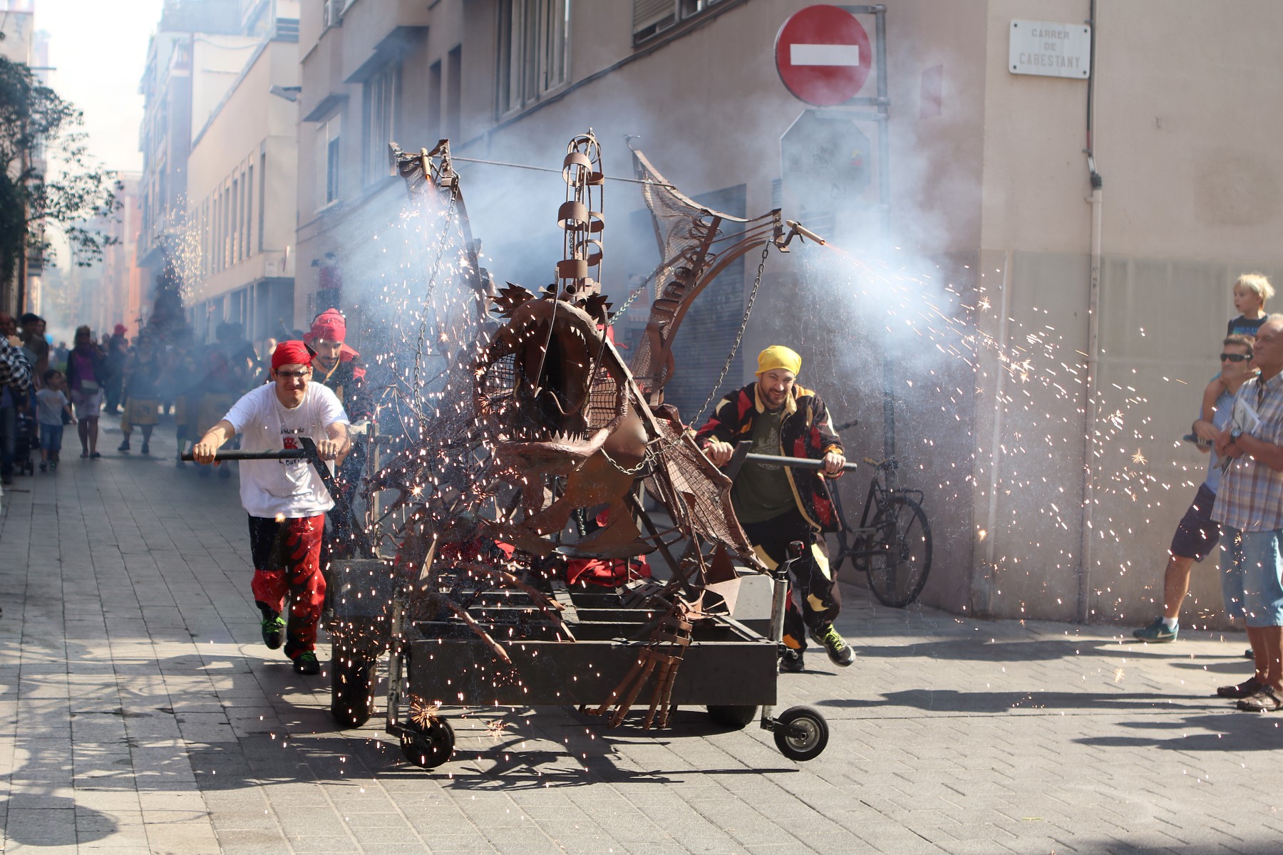 Totes les colles vam començar el particular cercavila a la Avinguda Diagonal Diagonal amb el carrer de Joan Güell, preparats per endinsar-nos un cop més al casc antic del nostre barri. Les dues colles adultes de foc i percussió que compartim el barri, Bocs i Diables, vàrem cremar de manera conjunta durant tot el seguici donant, un cop més, un espectacle sublim que tothom va gaudir i aplaudir. A més a més de treure a remenar les ales del Guardià de Les Corts, conjuntament amb Bocs i Repúbli-k de l’Avern!
