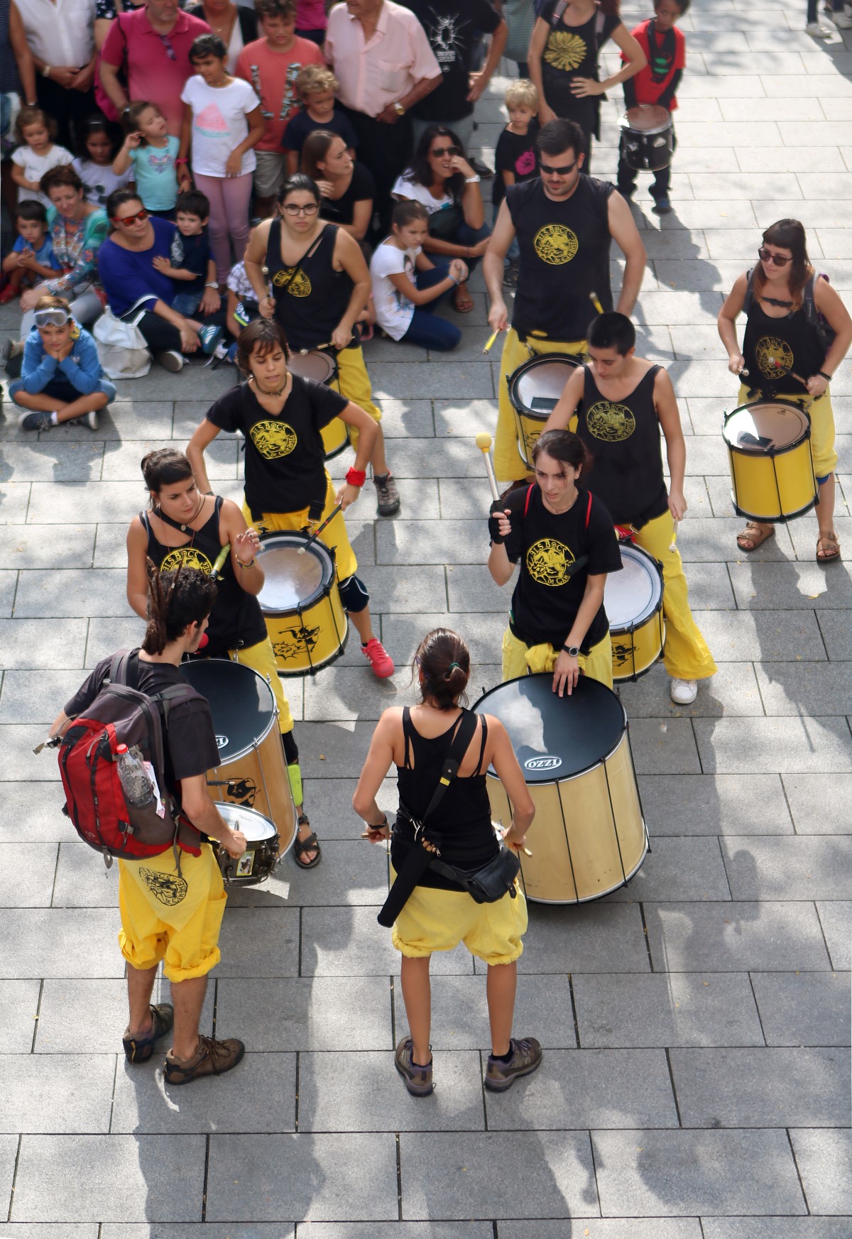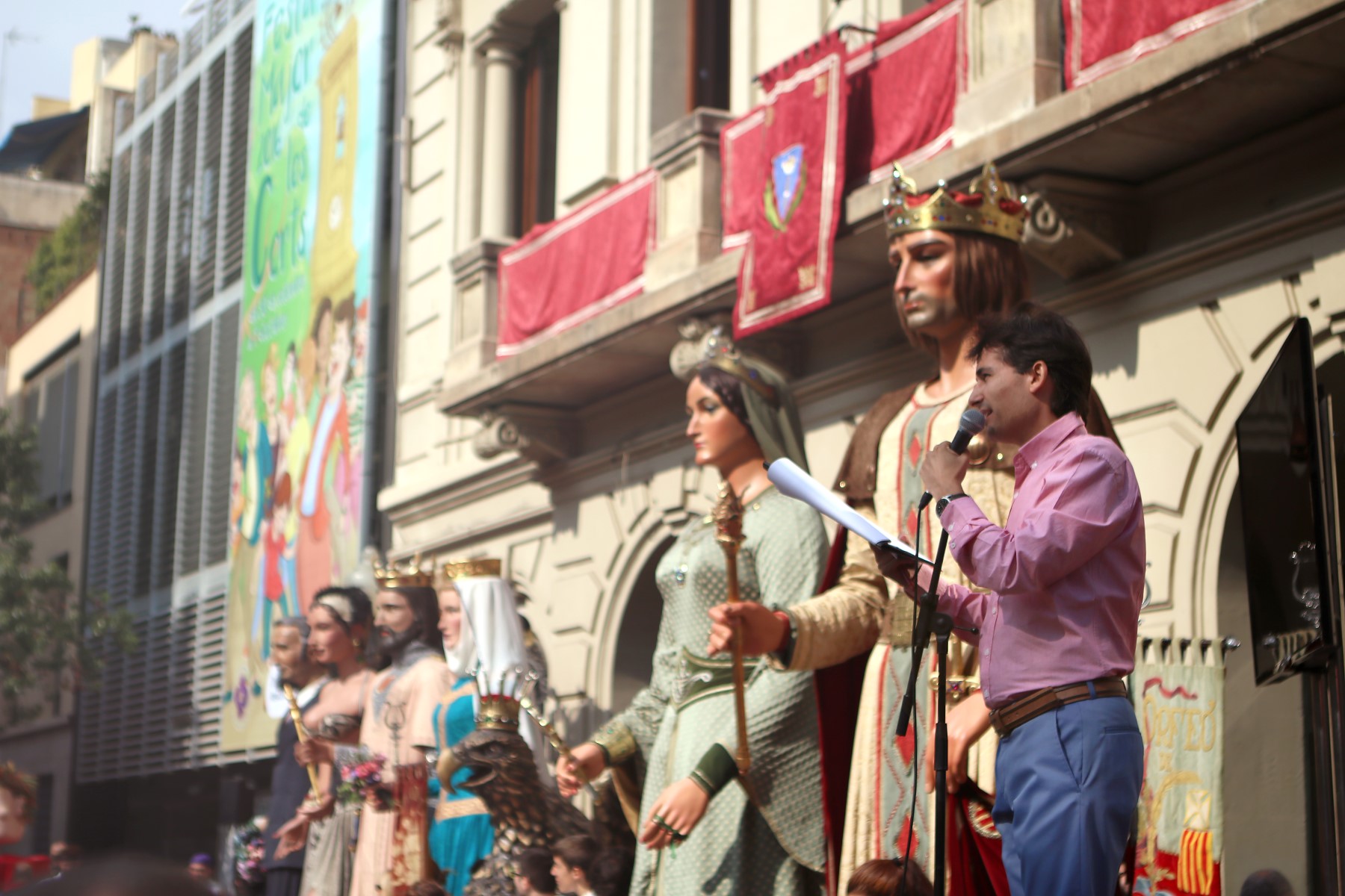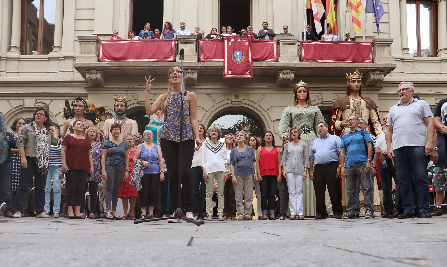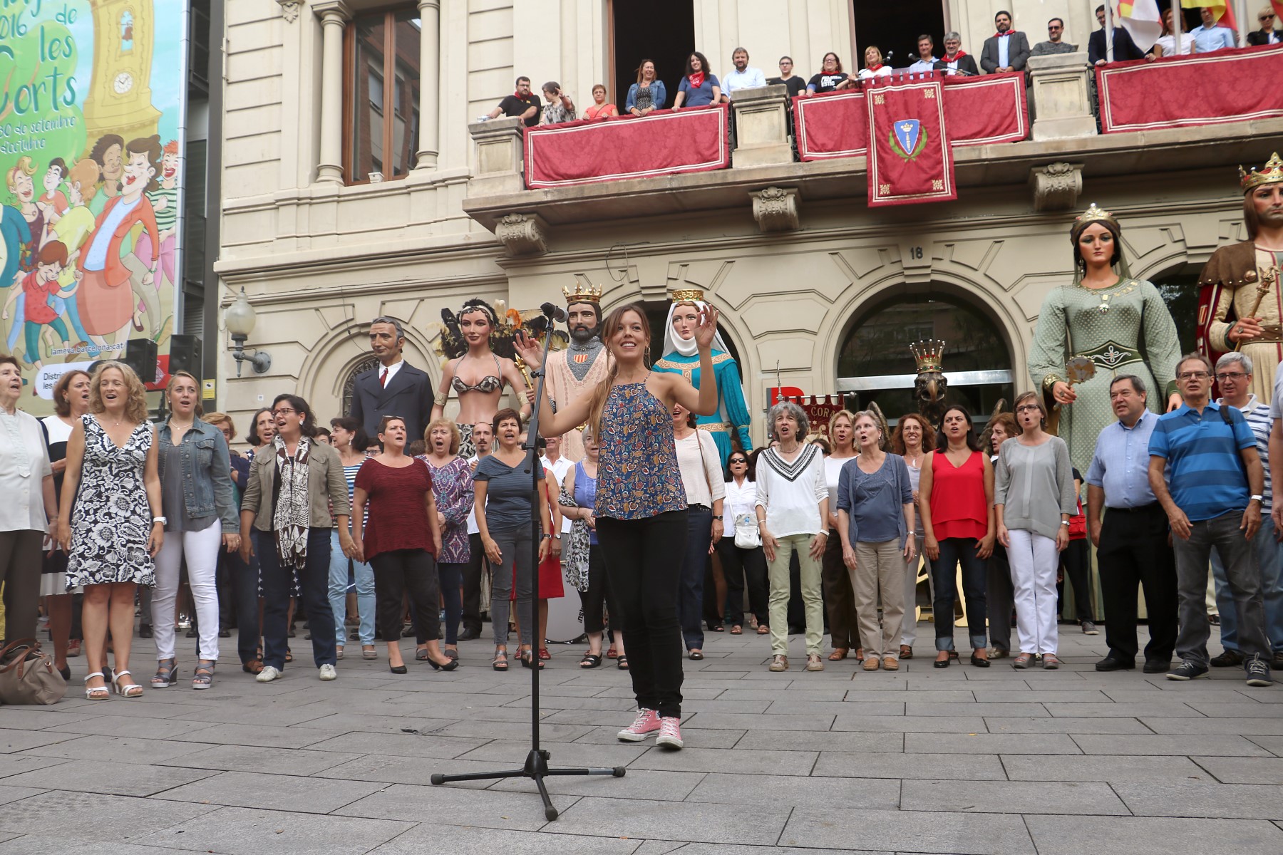 Un cop arribats a la plaça Comas i congregats davant de l’ajuntament, vam escoltar les solemnes paraules del pregó de Festa Major a càrrec de la directora de l’Orfeó de Les Corts -amb motiu del 50è aniversari d’aquesta entitat cultural-, que poc després ens van delectar amb una petita demostració del seu treball i amb un petit taller coral. Un cop fet això, es va procedir a fer els lluïments de les diferents colles de cultura popular que ens havíem congregat allà, tant de Les Corts com de convidades.