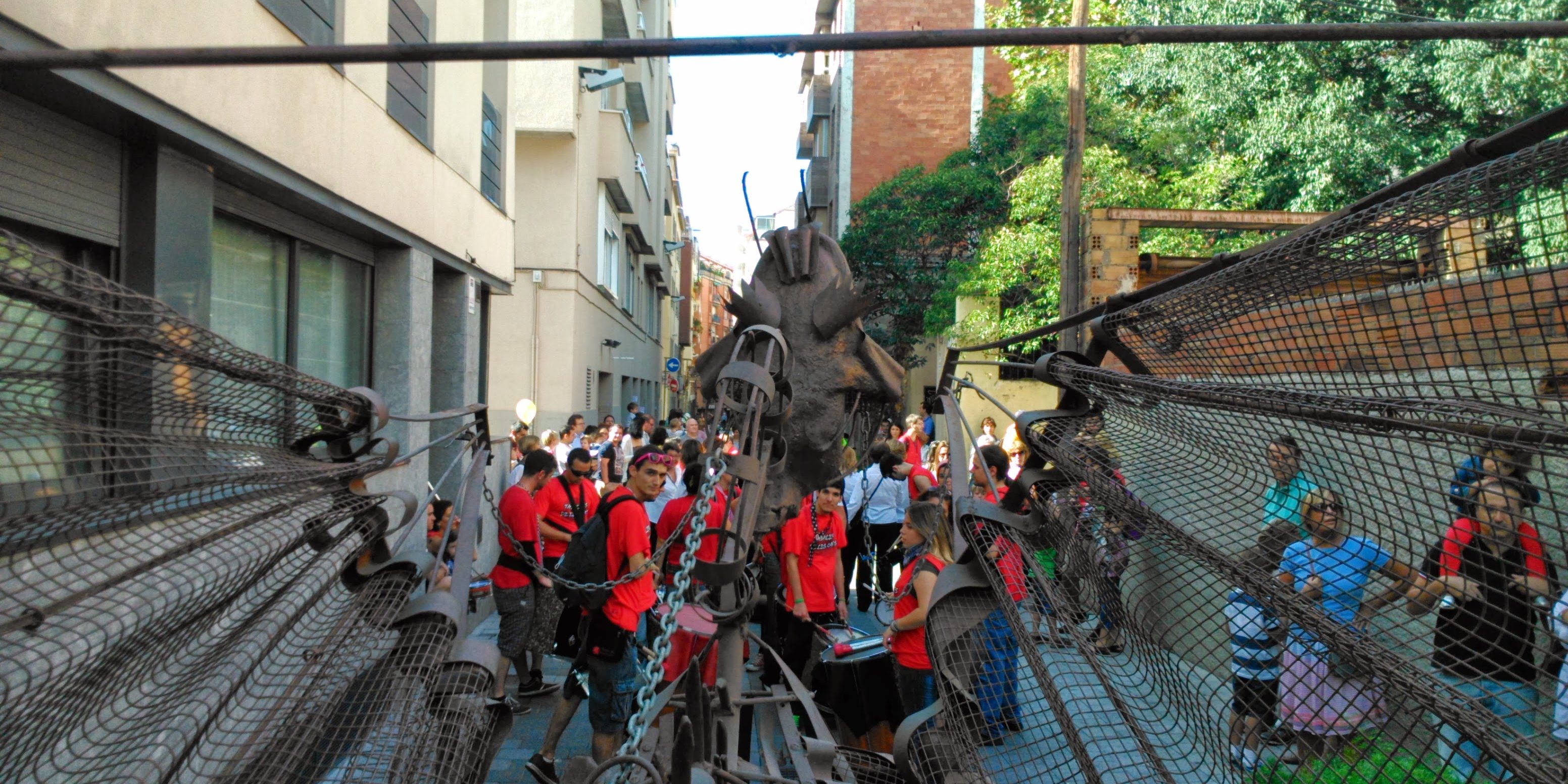 Doncs així va ser: bèsties de tot Barcelona, inclòs el Gaudiamus de Gràcia, La Porca de Sant Antoni i el Capellà d’Horta, padríns del Guardià, van desfilar pel barri el diumenge 6 d’octubre pel matí, despertant les Corts a ritme de tabals. El seguici popular estava liderat per l’Àliga de Barcelona i totes les colles de diables i tabalers del barri vam acompanyar al Guardià en la seva passejada pels carrers de Les Corts.