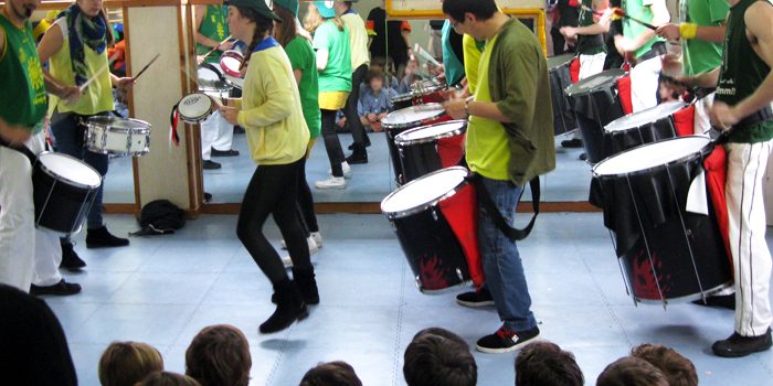 El passat divendres 1 d’abril els Tabalers de Les Corts vam anar a animar la festa brasilenya que s’olorava a l’Escola Betània-Patmos del barri. De bon matí els nostres percussionistes ja estaven carregant tabals cap a l’escola per anar a fer soroll. Ni la pluja ni el mal temps van poder callar la música que sortia dels instruments. Els nens més petits i els mestres van poder ballar durant una bona estona al llarg del mitgdia.