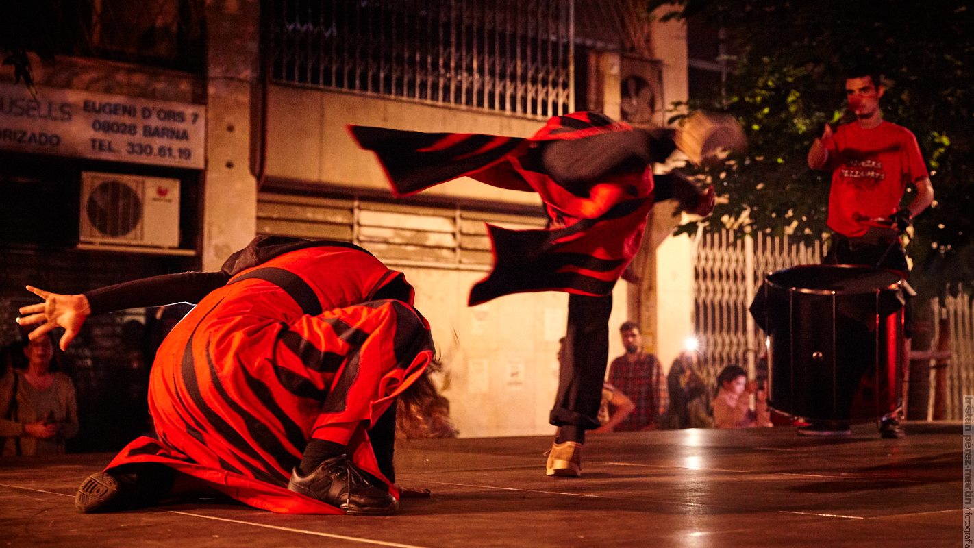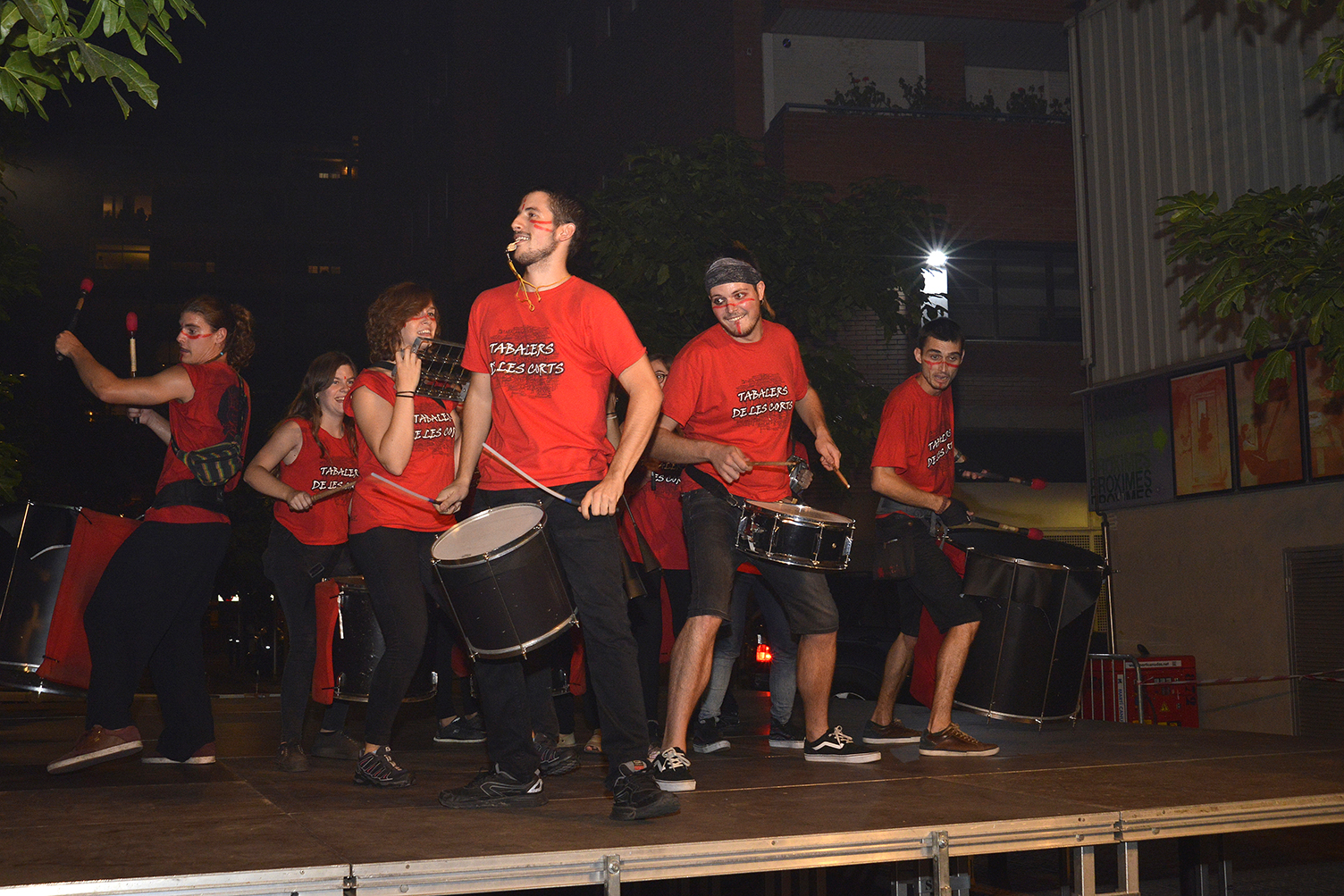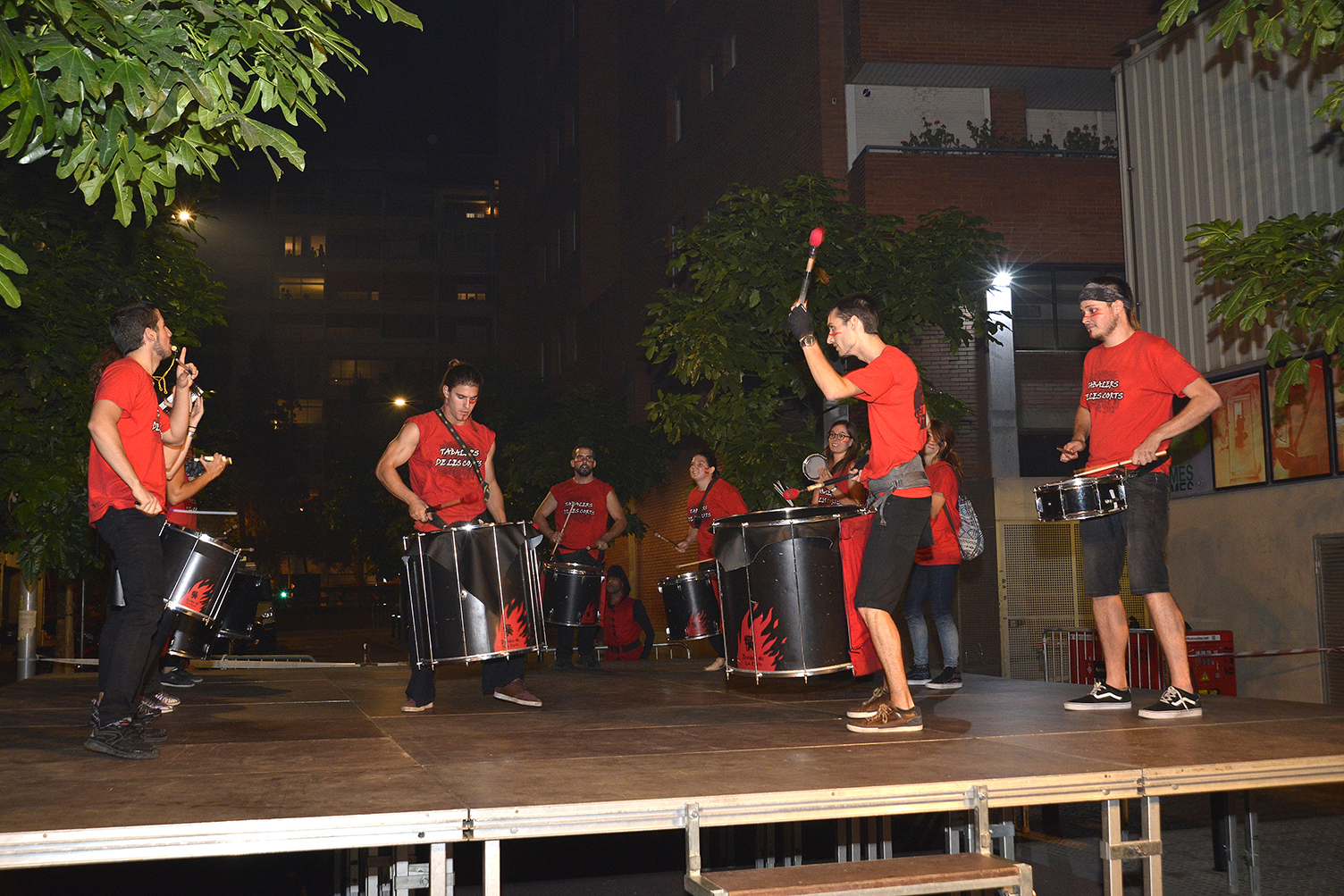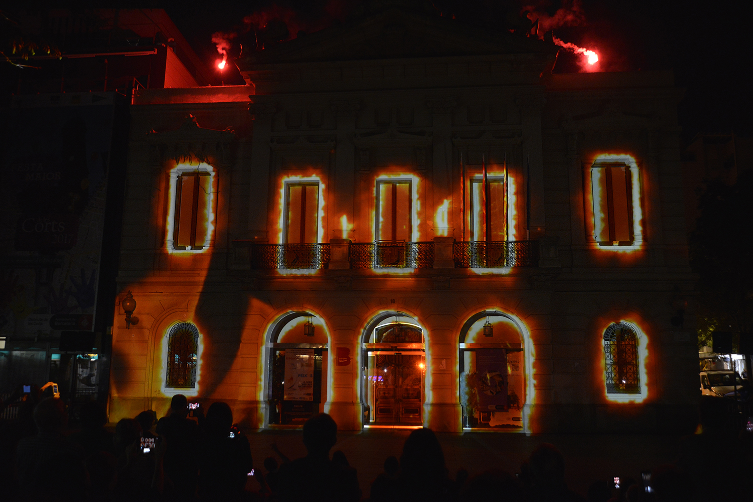 Enguany estrenàvem conjuntament amb La Caldera Les Corts, el centre d’arts escèniques veí nostre, el Toc d’Inici de Festa Major de Les Corts. Des de que ens vam conèixer al 2015, vam estar treballant en un acte que mescles la tradició del món del foc i la percussió al carrer amb la dansa contemporània. I fruit de reunions i amb unes quantes cerveses per ajudar, neix el Toc d’Inici amb una aposta clara per la projecció d’un mapping a la façana de l’Ajuntament de Les Corts.