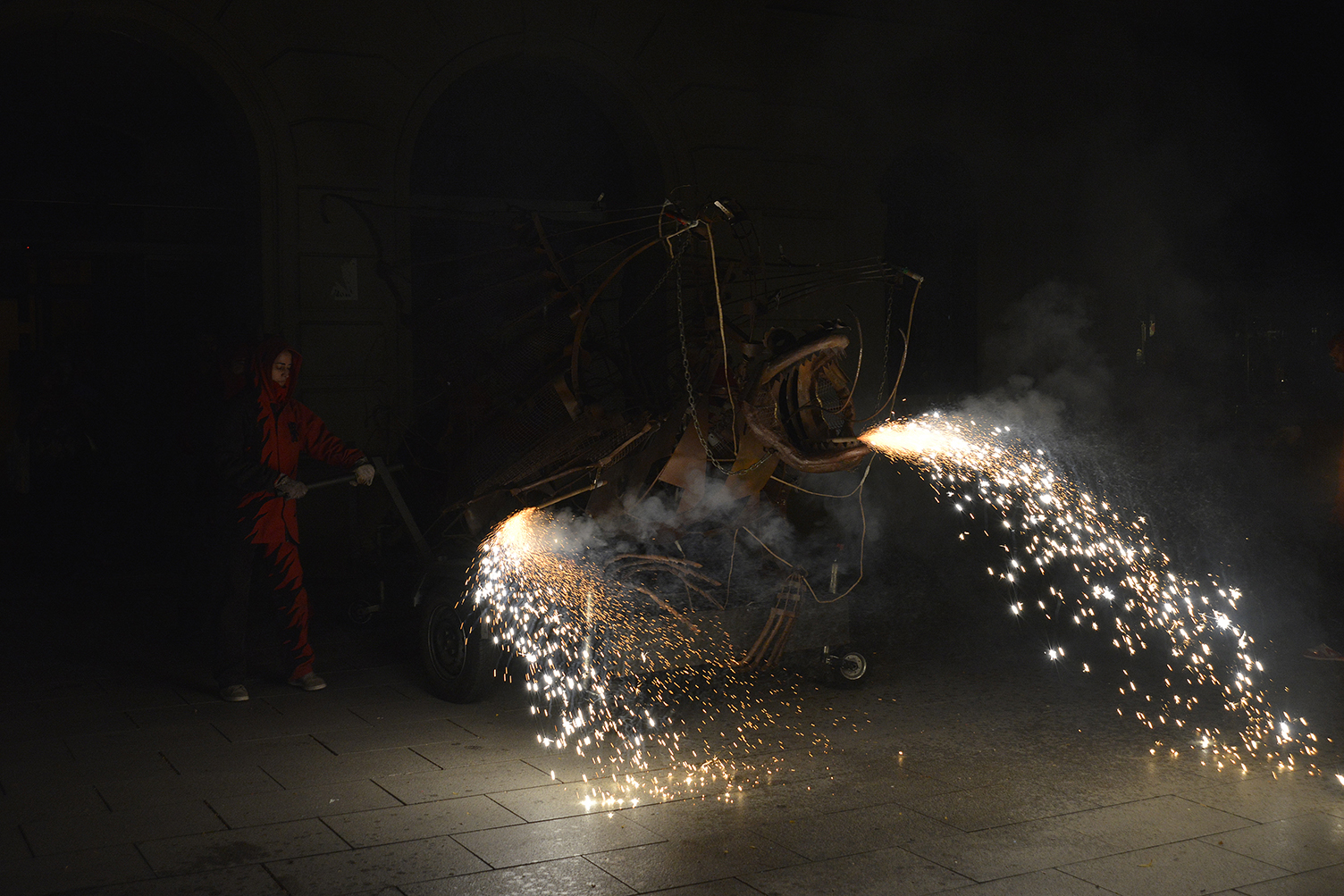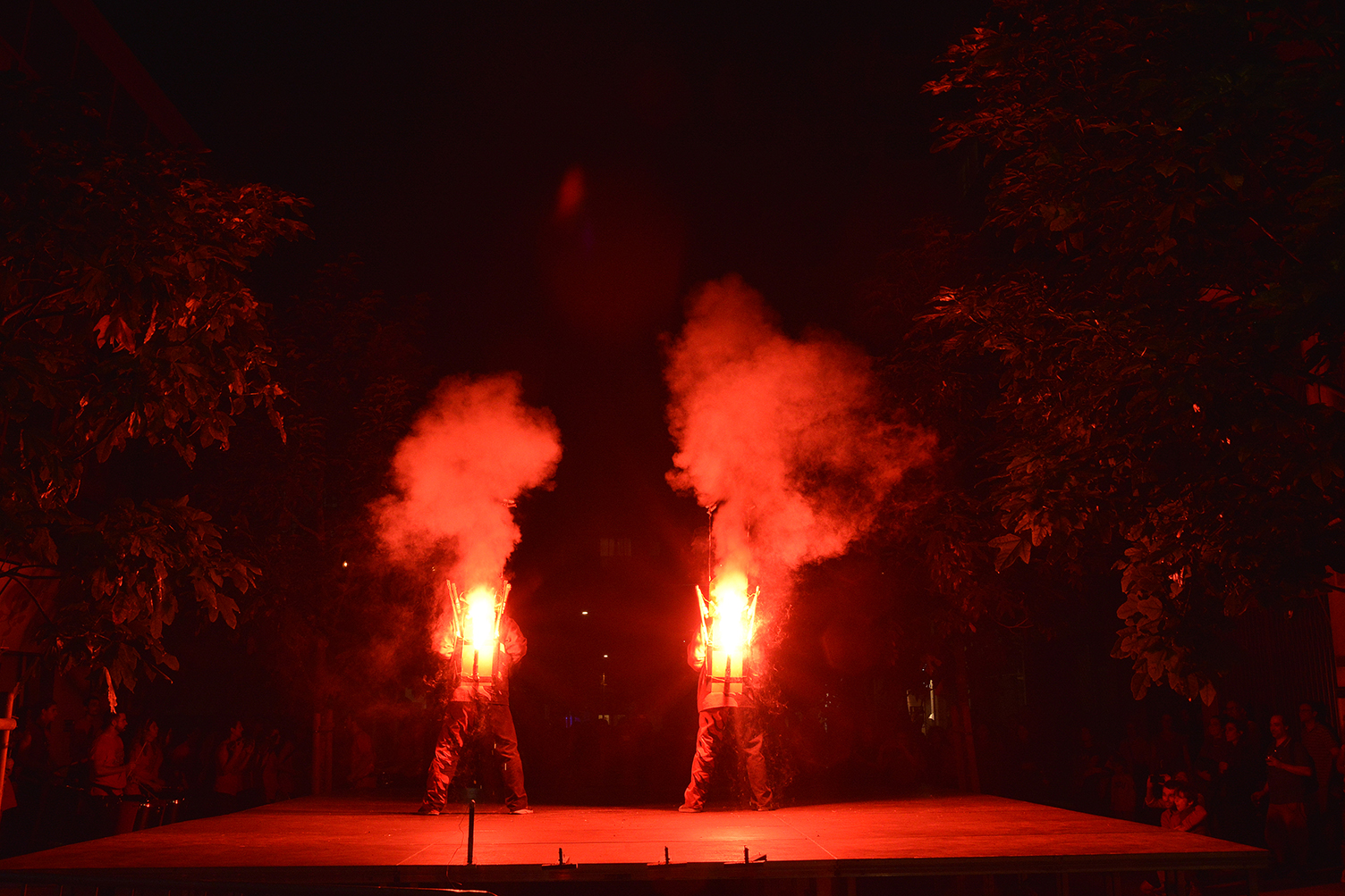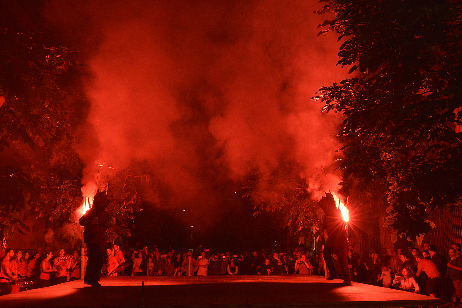Al finalitzar el mapping, una petita cercavila d’inici de Festa Major de Les Corts! Amb El Guardià de Les Corts, la Repúbli-k de l’Avern, Diables i Timbalers d’Itaca, Ulisses el Gegantó d’Itaca i uns servidors. Alegria i disbauxa fins arribar a l’edifici de La Caldera Les Corts, on realitzaríem l’espectacle de foc, percussió i dansa contemporània. Tant dos ballarins de La Caldera vestits d’espurna que reviu al so dels tabalers, com el ball i encesa de les motxilles de foc, tot fruit de la feina conjunta de La Caldera i Diables de Les Corts.